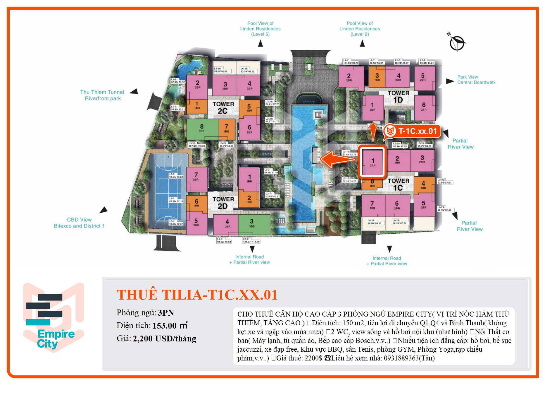 CHO THUÊ CĂN HỘ CAO CẤP 3 PHÒNG NGỦ EMPIRE CITY( VỊ TRÍ NÓC HẦM THỦ THIÊM, TẦNG CAO ) ⭐Diện tích: 150 m2, tiện lợi di chuyển Q1,Q4 và Bình Thạnh( không kẹt xe và ngập vào mùa mưa) ⭐2 WC, view sông và hồ bơi nội khu (như hình) ⭐Nội Thất cơ bản( Máy lạnh, tủ quần áo, Bếp cao cấp Bosch,v.v..) ⭐Nhiều tiện ích đẳng cấp: hồ bơi, bể sục jaccuzzi, xe đạp free, Khu vực BBQ, sân Tenis, phòng GYM, Phòng Yoga,rạp chiếu phim,v.v..) 💵Giá thuê: 2200$ ☎Liên hệ xem nhà: 0931889363(Tân)