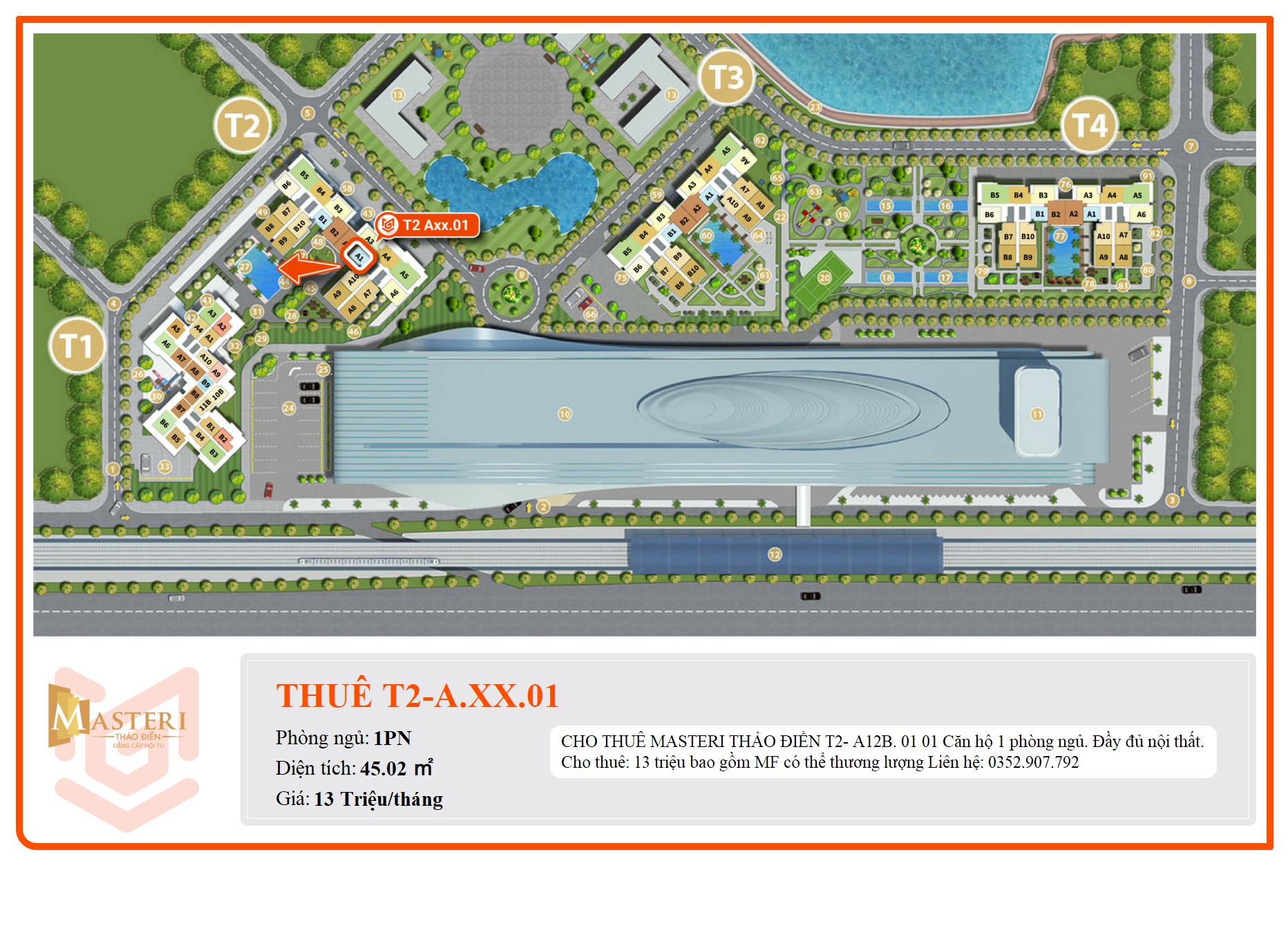 Masteri Thảo Điền là sản phẩm căn hộ cao cấp của tập đoàn Masterise Homes (tiền thân là Thảo Điền Investment). Cách Xa Lộ Hà Nội chỉ vài bước chân, phía sau chỉ 200m là dòng Sông Saigon. Đây thực sự là không gian thiên nhiên trong lành để bạn và gia đình hưởng thụ trọn vẹn hương vị cuộc sống. Ngoài ra, dự án cũng kết nối trực tiếp với ga An Phú (ga số 7), tuyến tàu điện Metro đô thị số 1 Bến Thành – Suối Tiên, đặc biệt bạn chỉ mất 7 phút vào trung tâm Quận 1 và các quận lân cận.
