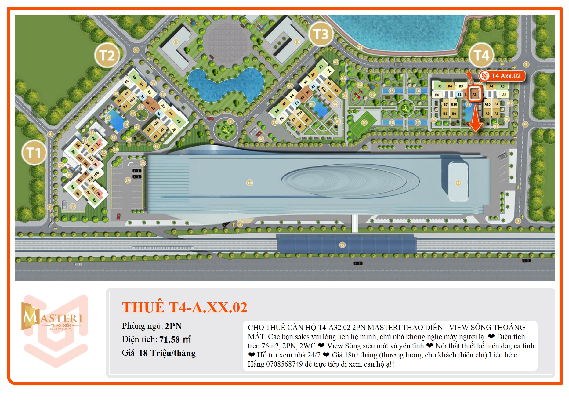 CHO THUÊ CĂN HỘ T4-A32.02 2PN MASTERI THẢO ĐIỀN - VIEW SÔNG THOÁNG MÁT.