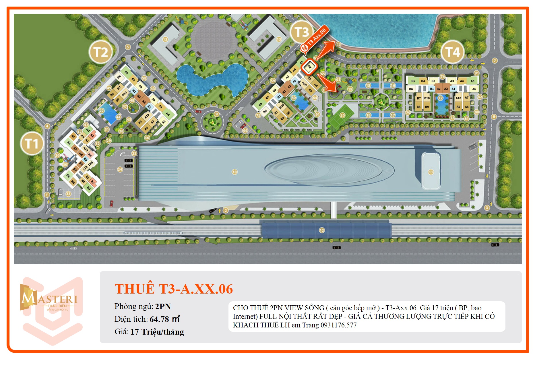Masteri Thảo Điền là sản phẩm căn hộ cao cấp của tập đoàn Masterise Homes (tiền thân là Thảo Điền Investment). Cách Xa Lộ Hà Nội chỉ vài bước chân, phía sau chỉ 200m là dòng Sông Saigon. Đây thực sự là không gian thiên nhiên trong lành để bạn và gia đình hưởng thụ trọn vẹn hương vị cuộc sống. Ngoài ra, dự án cũng kết nối trực tiếp với ga An Phú (ga số 7), tuyến tàu điện Metro đô thị số 1 Bến Thành – Suối Tiên, đặc biệt bạn chỉ mất 7 phút vào trung tâm Quận 1 và các quận lân cận.