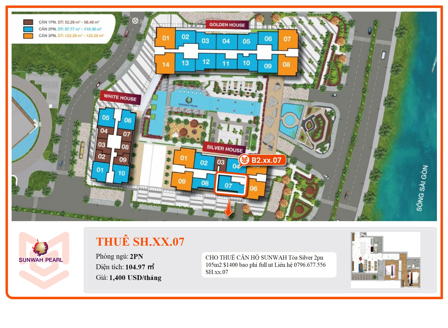 Tòa Silver 2pn 105m2 $1400 bao phí full nt