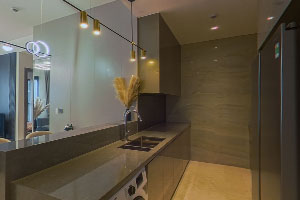 Thiết kế sang trọng, nội thất thể hiện sự sang trọng ở các chi tiết đắt giá như trần nhà cao, khung cửa sổ lớn, những tấm đá cẩm thạch lắp đặt tỉ mỉ trên mặt quầy bếp, sàn nhà, sàn và tường phòng tắm.