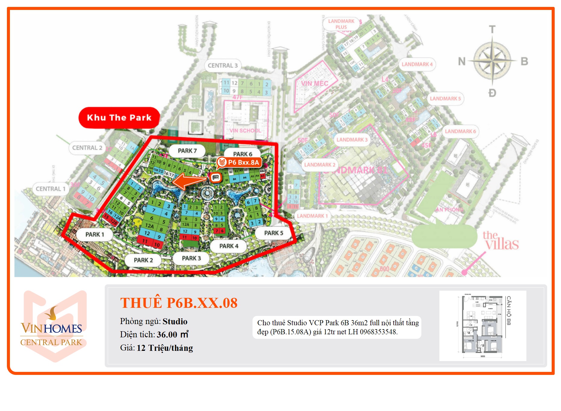 Cho thuê Studio VCP Park 6B 36m2 full nội thất tầng đẹp (P6B.15.08A) giá 12tr net LH 0968353548.