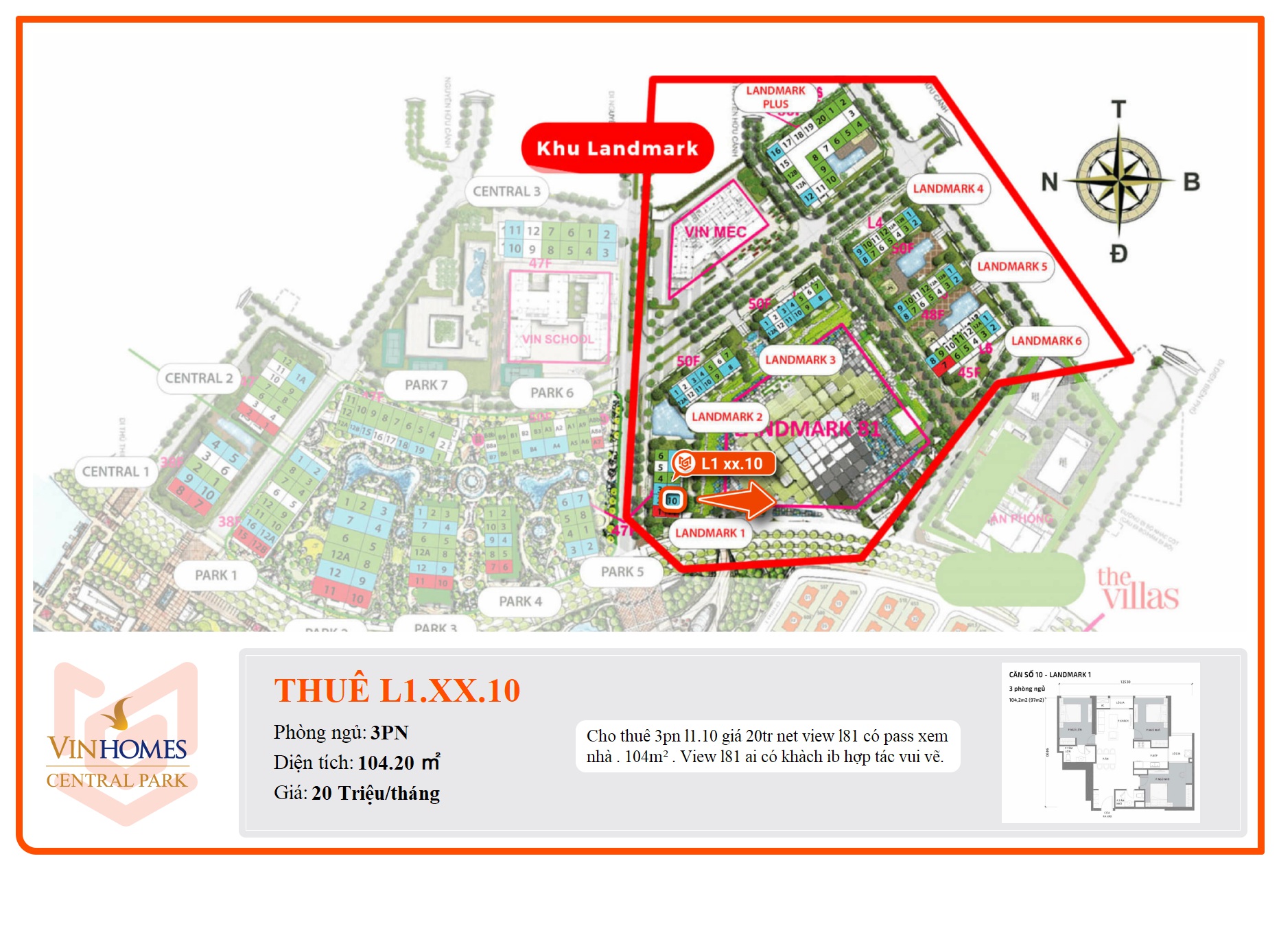Cho thuê 3pn l1.10 giá 20tr net view l81 có pass xem nhà . 104m² . View l81 ai có khàch ib hợp tác vui vẽ.