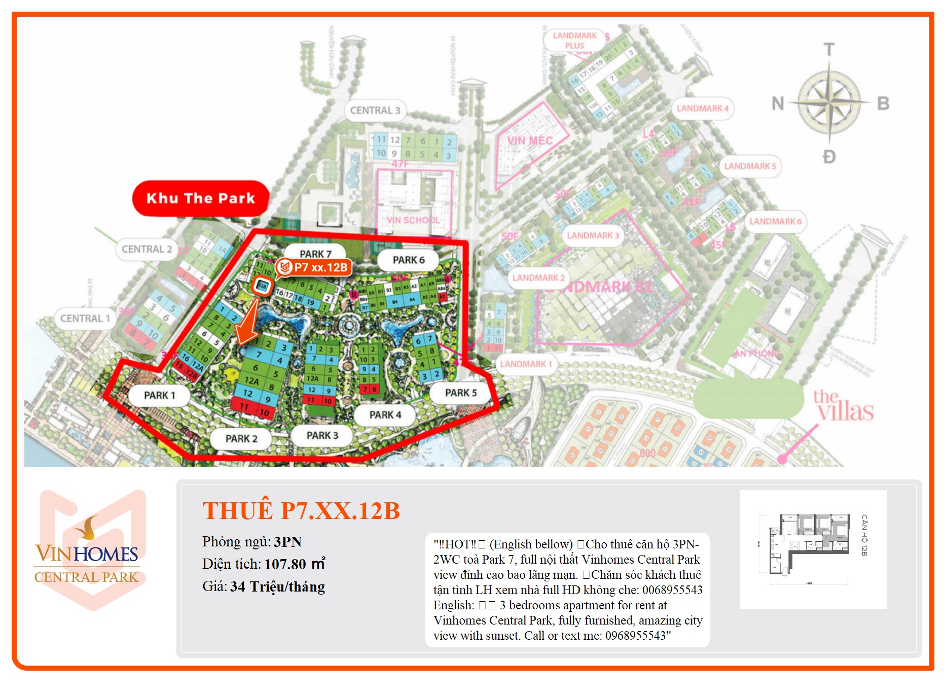 ☘Cho thuê căn hộ 3PN-2WC toà Park 7, full nội thất Vinhomes Central Park view đỉnh cao bao lãng mạn.