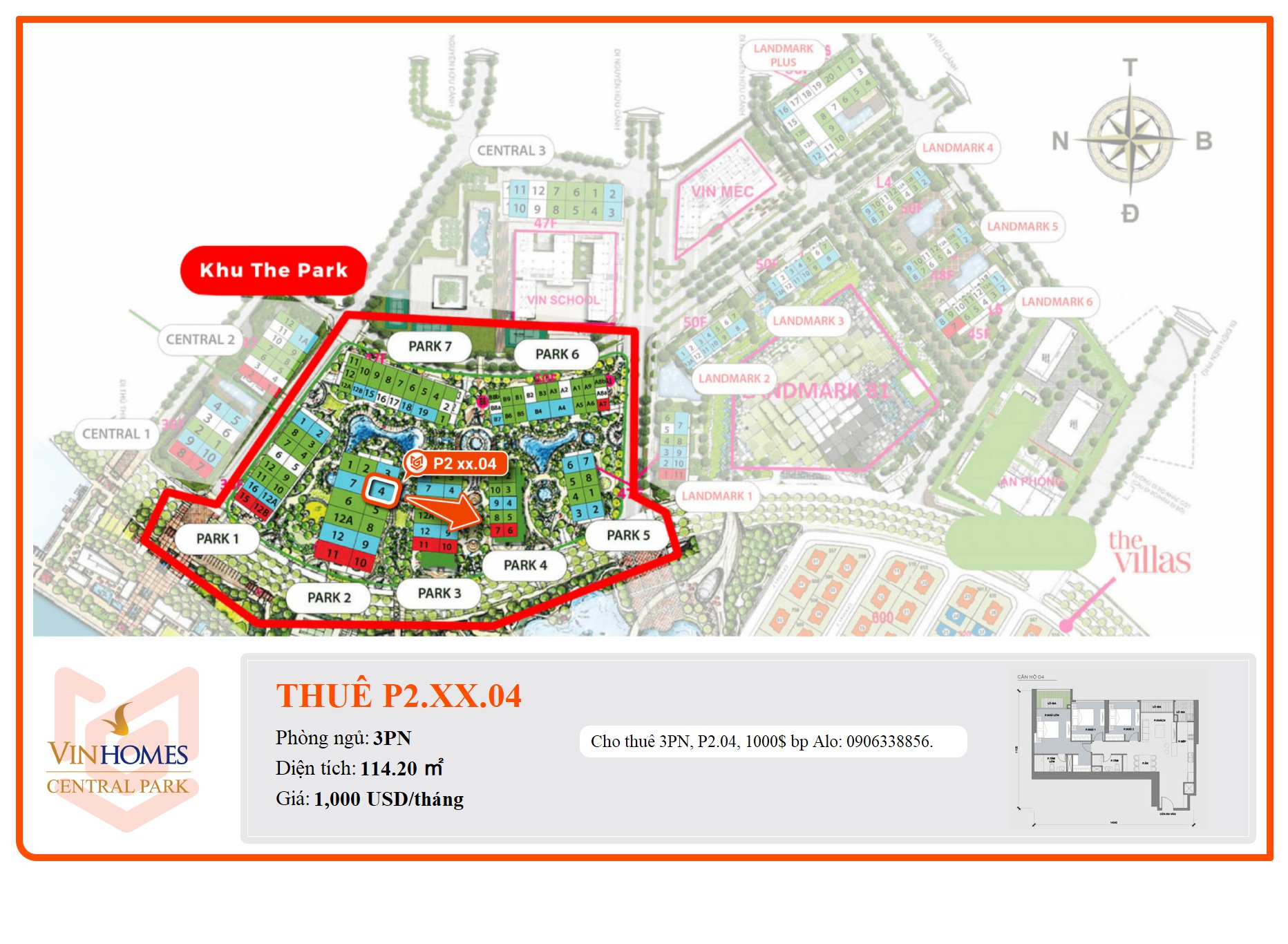 Cho thuê 3PN, P2.04, 1000$ bp