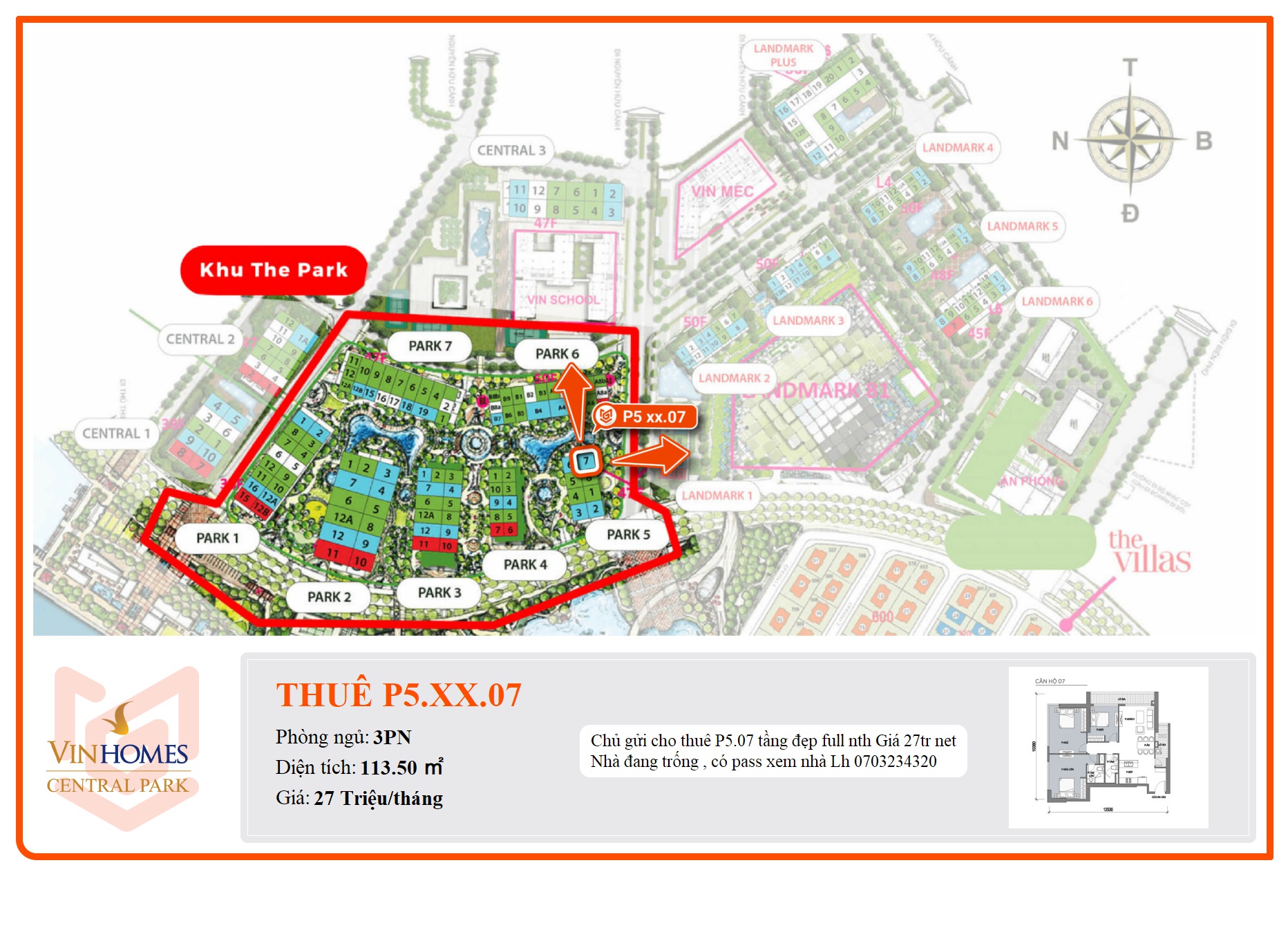 Chủ gửi cho thuê P5.07 tầng đẹp full nth