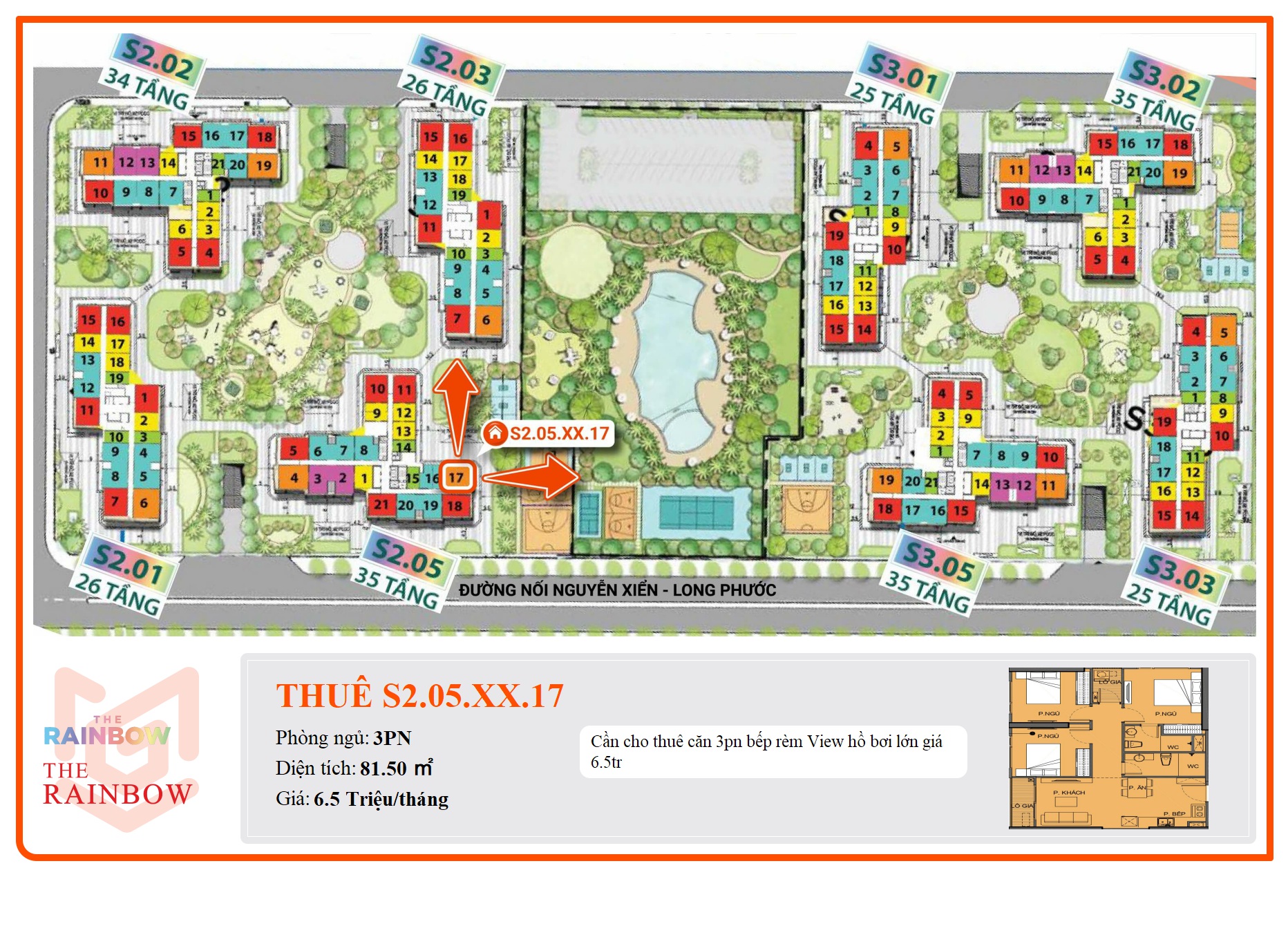 Phân khu The Rainbow thuộc đại đô thị Vinhomes Grand Park Quận 9 nằm ngay mặt tiền đường Nguyễn Xiển – Long Thạnh Mỹ – Quận 9. Khu vực này được xem là cửa ngõ phía Tây của đại đô thị này mang lai khả năng giao thông kết nối nhanh chóng, thuận tiện bởi lợi thế tiếp giáp trục đường Nguyễn Xiển; đường nội khu 30 – 20 – 13m và tuyến đường Vành đai 3 quan trọng của khu vực.