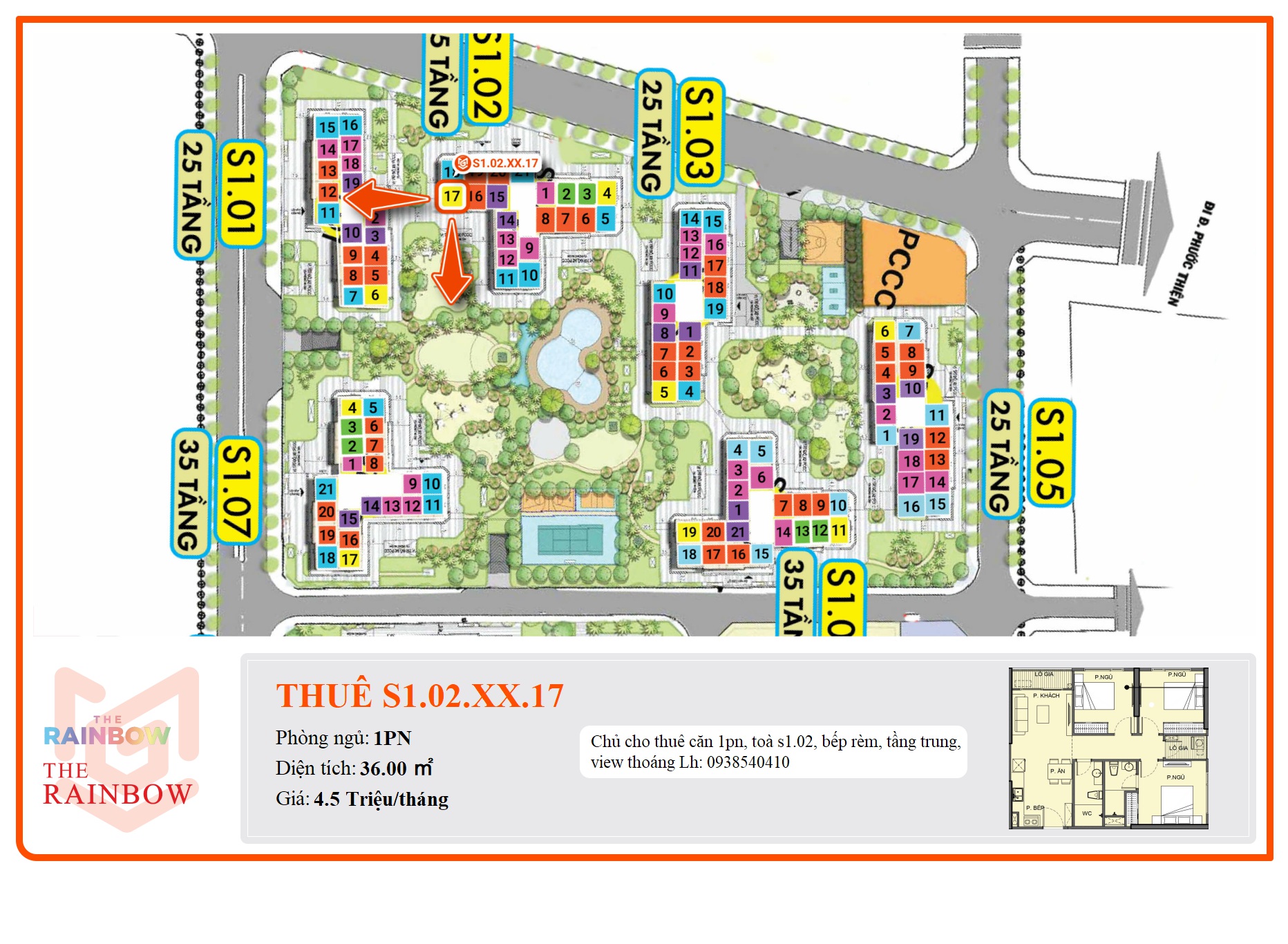 Chủ cho thuê căn 1pn, toà s1.02, bếp rèm, tầng trung, view thoáng