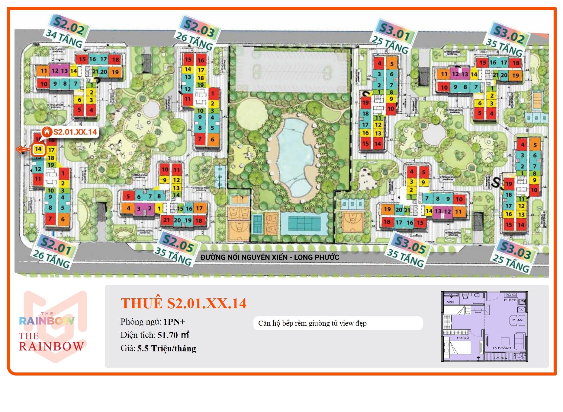 Phân khu The Rainbow thuộc đại đô thị Vinhomes Grand Park Quận 9 nằm ngay mặt tiền đường Nguyễn Xiển – Long Thạnh Mỹ – Quận 9. Khu vực này được xem là cửa ngõ phía Tây của đại đô thị này mang lai khả năng giao thông kết nối nhanh chóng, thuận tiện bởi lợi thế tiếp giáp trục đường Nguyễn Xiển; đường nội khu 30 – 20 – 13m và tuyến đường Vành đai 3 quan trọng của khu vực.