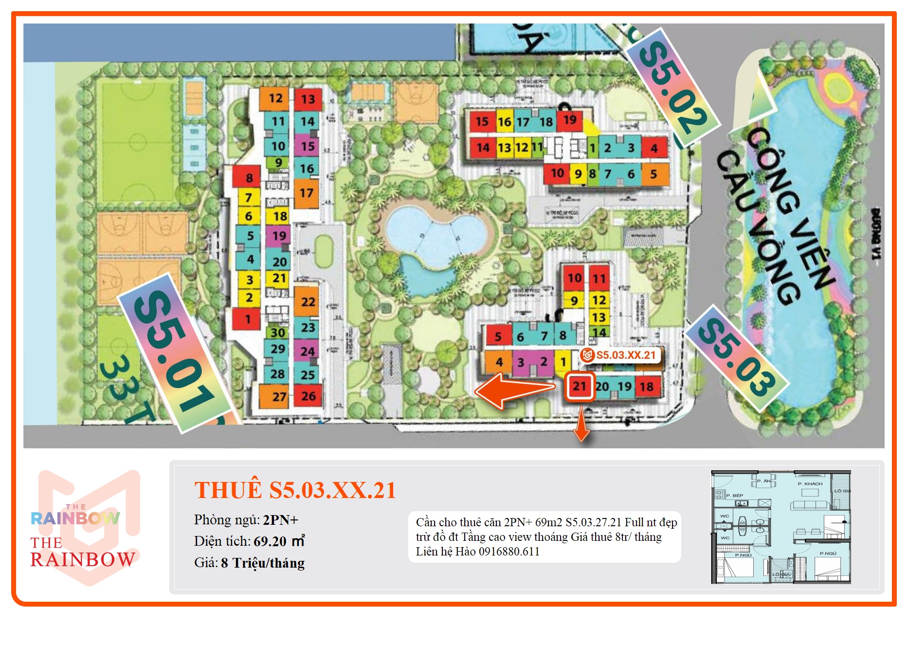 Cần cho thuê căn 2PN+ 69m2 S5.03.27.21