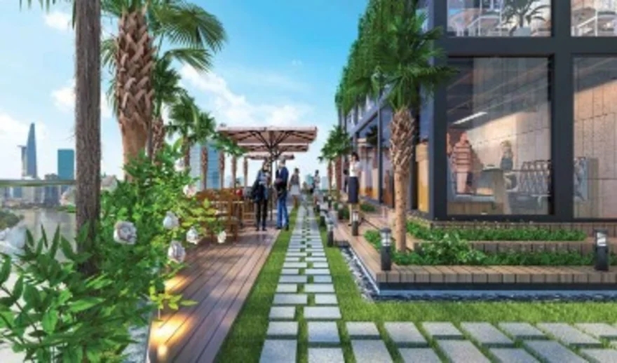 - Trong đó, tổ hợp hồ bơi vô cực, hồ Jacuzzi, hồ bơi trẻ em, vườn treo BBQ và Coffee Lounge nằm trên tầng 25, 26 với tầm nhìn toàn cảnh ra sông Sài Gòn và quận 1.