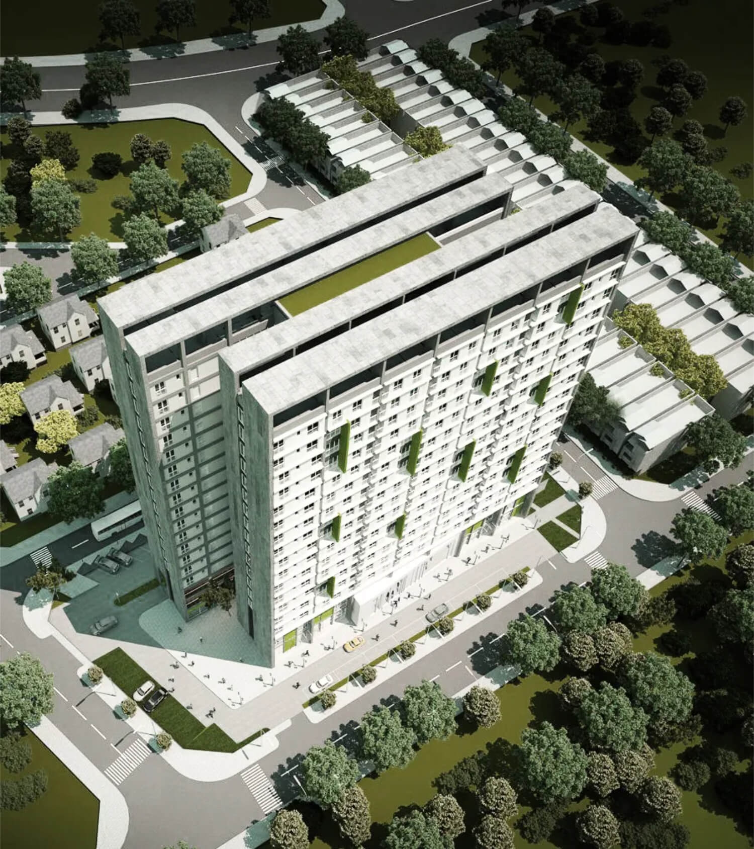 - Khuôn viên cây xanh và khu đi bộ thoáng mát bao quanh các block nhà.