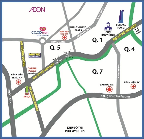 Từ dự án The Avila, cư dân dễ dàng di chuyển về khu trung tâm Quận 1, Quận 2 khoảng 15 phút và mất từ 5 phút để đến được trung tâm quận 5,6. Ngoài ra, từ dự án The Avila bạn có thể dễ dàng di chuyển về các quận Tân Bình, Tân Phú, Quận 3, quận 10…