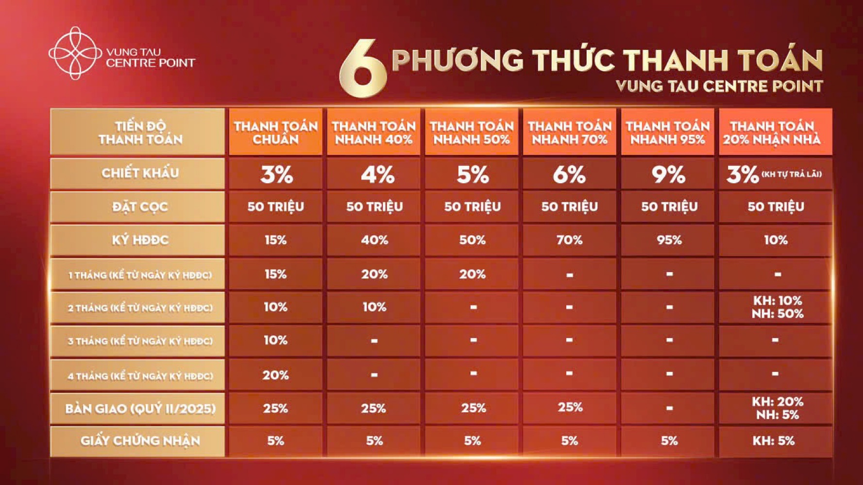 1. Chính sách THANH TOÁN: - Chuẩn : chiết khấu 3% - Nhanh 40% : chiết khấu 4% - Nhanh 50% : chiết khấu 5% - Nhanh 70% : chiết khấu 6% - Nhanh 95% : chiết khấu 9% - HỖ TRỢ TÀI CHÍNH: chiết khấu 3% (đối với KH không nhận hỗ trợ lãi suất) (TB ban hành áp dụng từ 1/1/2025 đến khi có TB mới thay thế)