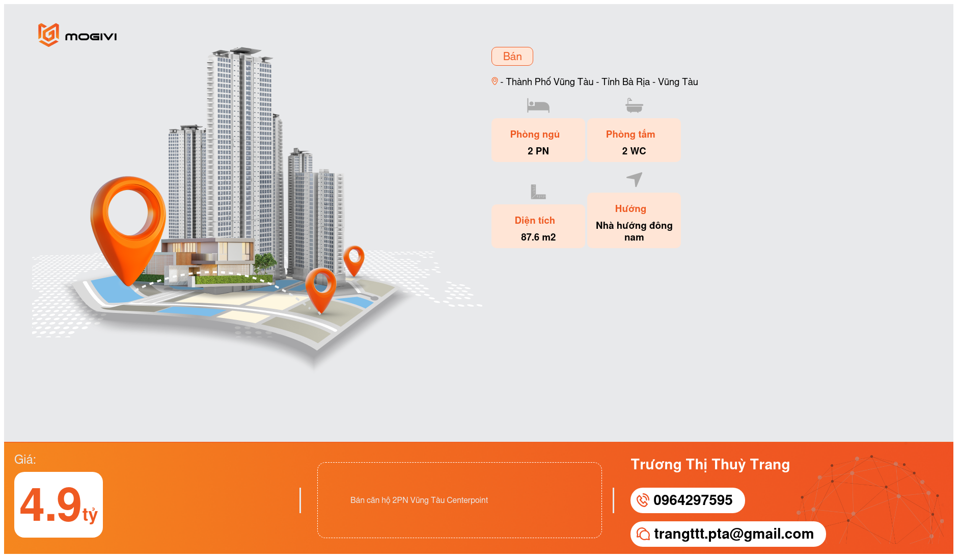 🌊BÁN CĂN HỘ VŨNG TÀU CENTRE POINT – 87,6m² VIEW BIỂN ĐẸP Giá chỉ 4,9 tỷ – Miễn phí quản lý 2 năm 💥 Thông tin căn hộ: + Diện tích: 87m² – thiết kế 2PN, 2WC, ban công ĐB rộng view thoáng mát quanh năm + Pháp lý: Sổ hồng riêng, sở hữu lâu dài ✨ Điểm nổi bật: + Vị trí trung tâm TP. Vũng Tàu, gần Bãi Sau, bãi Long Cung Gateway + Tiện ích nội khu chuẩn resort: hồ bơi, gym, TTTM, rạp chiếu phim, nhà hàng, khu vui chơi trẻ em. + View tuyệt đẹp, thích hợp nghỉ dưỡng, cho thuê hoặc đầu tư sinh lời. Liên hệ ngay để nhận bảng giá & xem căn thực tế Hotline/Zalo: 0964.297.595 - Thuỳ Trang