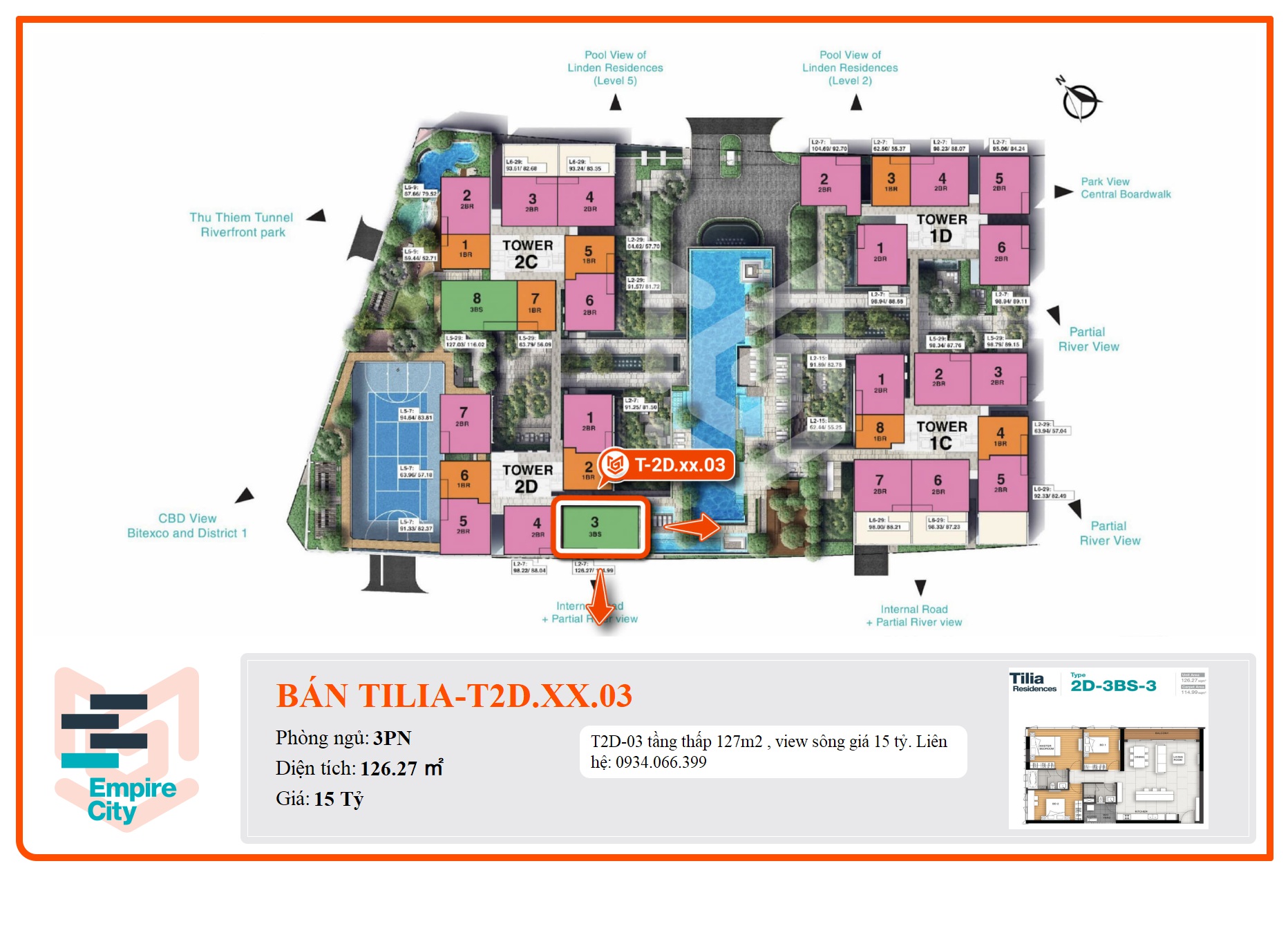 T2D-03 tầng thấp 127m2 , view sông giá 15 tỷ.