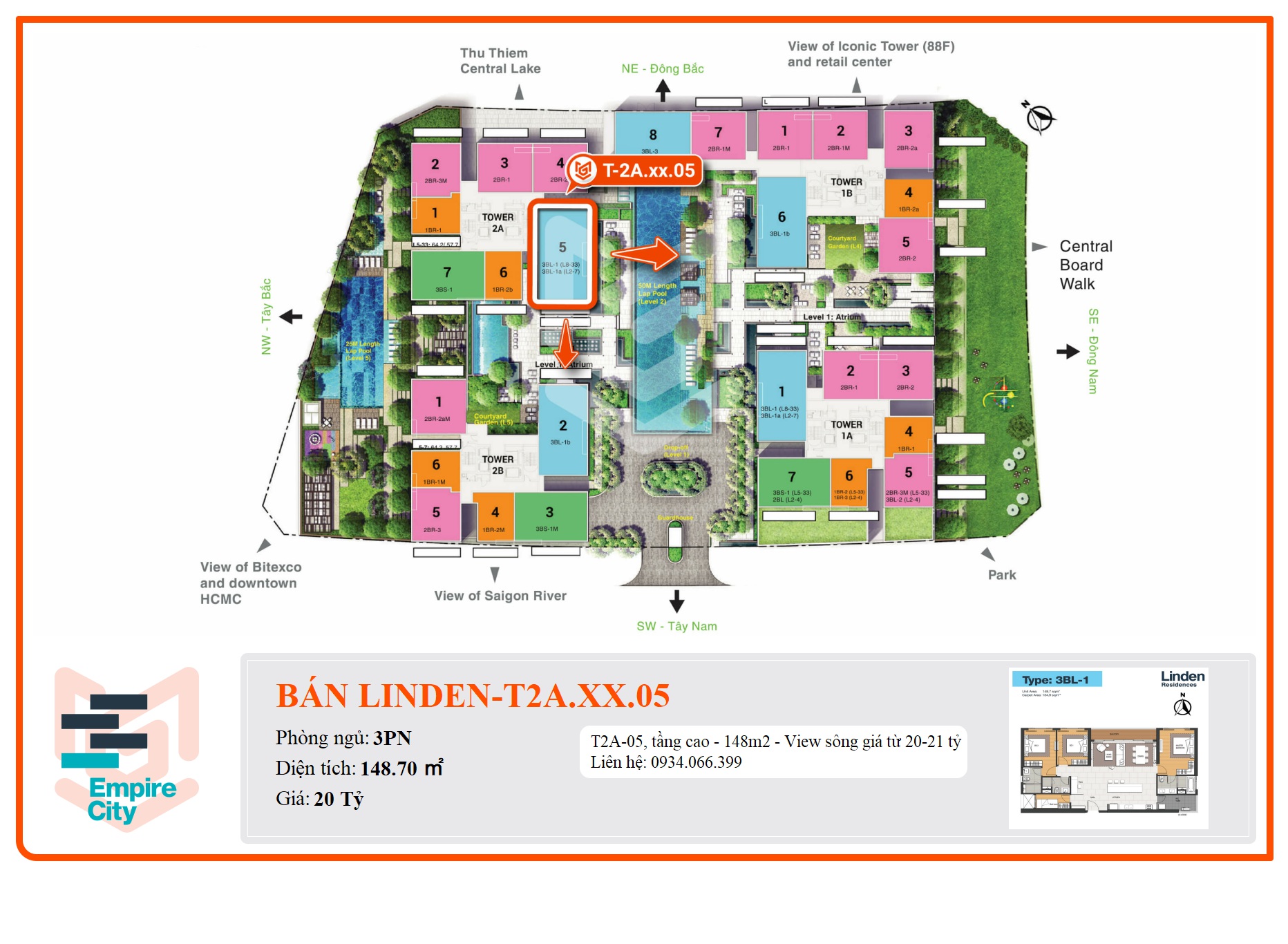 T2A-05, tầng cao - 148m2 - View sông giá từ 20-21 tỷ