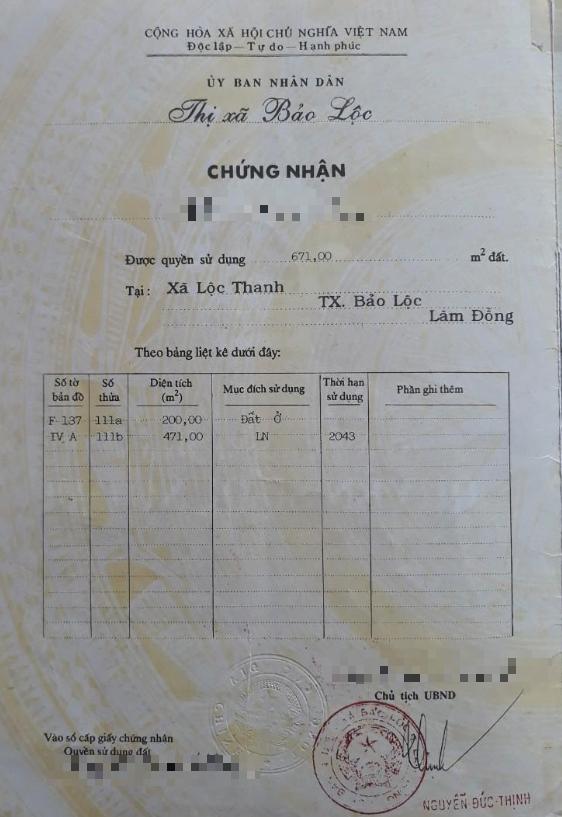 Chính chủ kẹt tiền cần bán gấp đất thổ cư, chiều ngang 23m, đường Lê Đình Chinh thành phố Bảo Lộc. - Diện tích sử dụng: 1.500 m2, 200 m2 thổ cư - Chiều ngang đất: 23m. - Hướng Tây Bắc, đường thảm nhựa 8m, view đồi. - Giá bán: 180.000.000/ mét ngang LH chính chủ: 0968400359 (Mr.Tú)