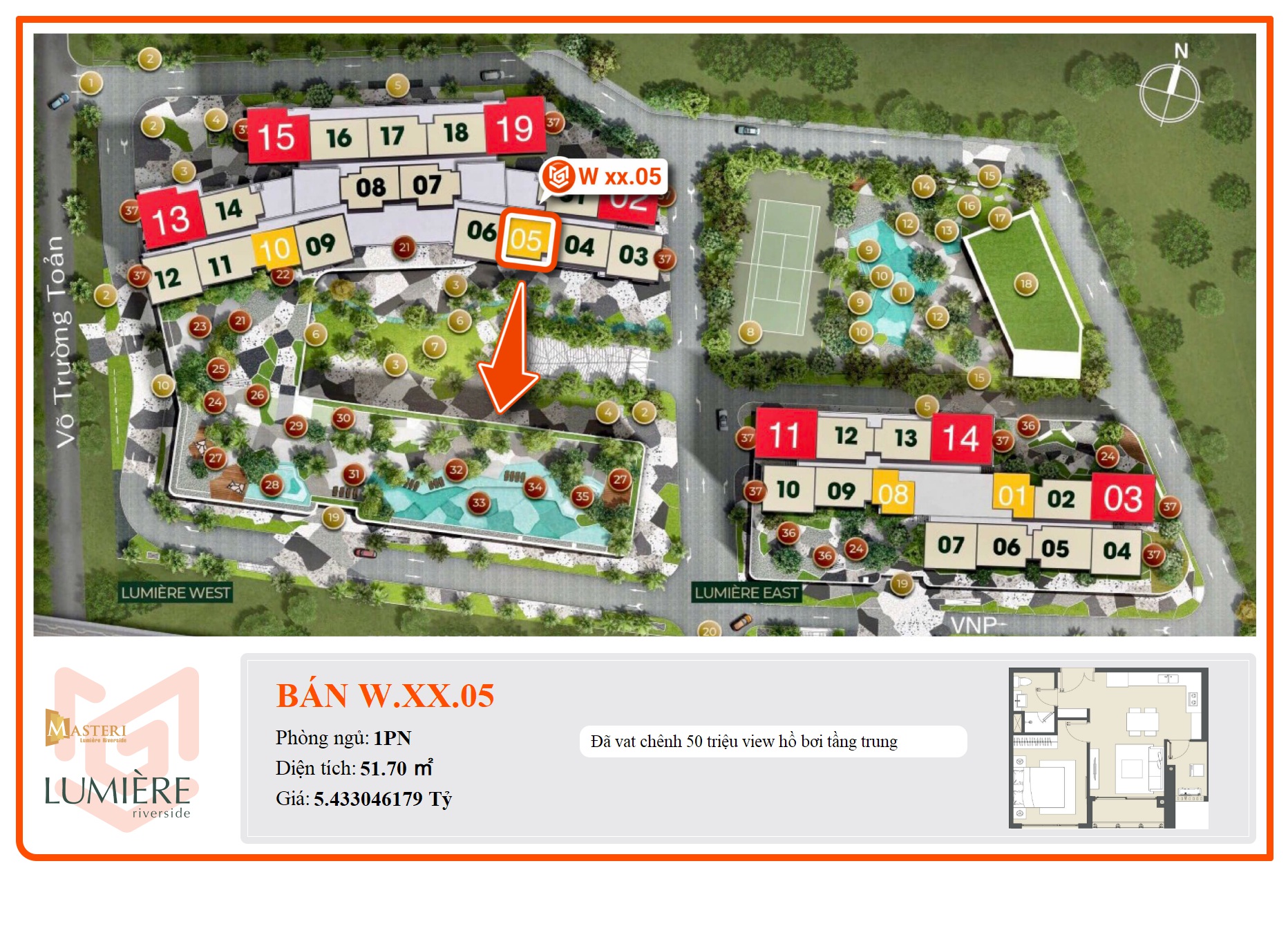 - Tòa Lumiere West gồm 44 tầng căn hộ; 2 - 3 tầng Shophouse khối đế; 6 tầng văn phòng cho thuê; 2 tầng hầm & 4 tầng đỗ xe nổi.