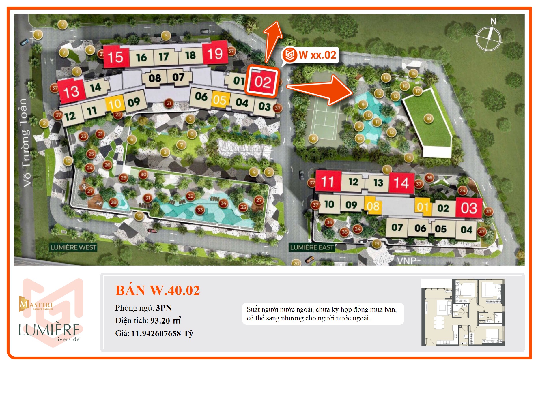 Về mặt bằng, Lumiere Riverside có quy mô gồm 02 tòa căn hộ cao cấp là tòa Lumiere West và tòa Lumiere East. Cụ thể như sau: