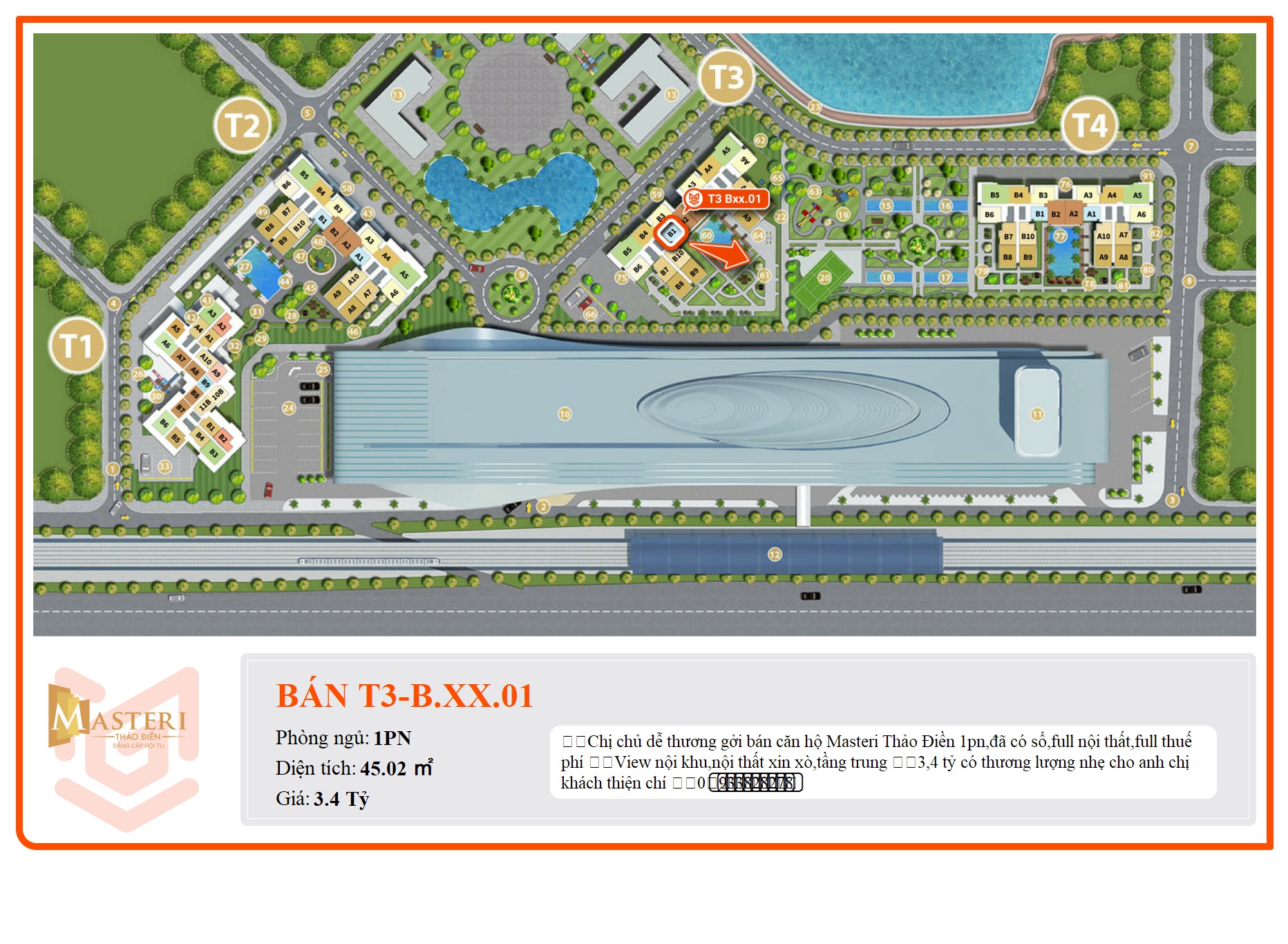 Masteri Thảo Điền là sản phẩm căn hộ cao cấp của tập đoàn Masterise Homes (tiền thân là Thảo Điền Investment). Cách Xa Lộ Hà Nội chỉ vài bước chân, phía sau chỉ 200m là dòng Sông Saigon. Đây thực sự là không gian thiên nhiên trong lành để bạn và gia đình hưởng thụ trọn vẹn hương vị cuộc sống. Ngoài ra, dự án cũng kết nối trực tiếp với ga An Phú (ga số 7), tuyến tàu điện Metro đô thị số 1 Bến Thành – Suối Tiên, đặc biệt bạn chỉ mất 7 phút vào trung tâm Quận 1 và các quận lân cận.