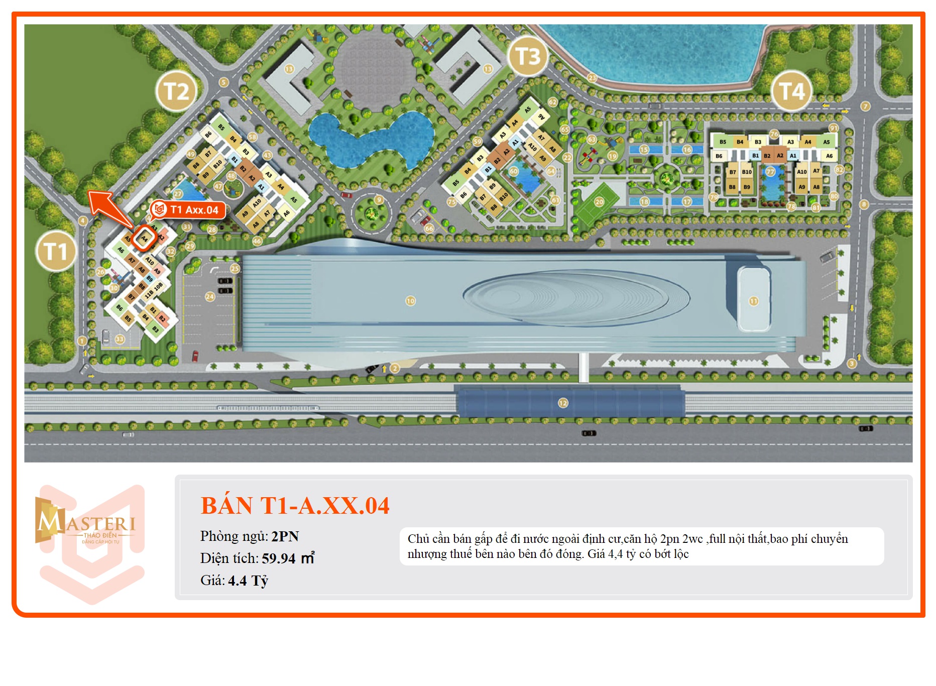 Masteri Thảo Điền là sản phẩm căn hộ cao cấp của tập đoàn Masterise Homes (tiền thân là Thảo Điền Investment). Cách Xa Lộ Hà Nội chỉ vài bước chân, phía sau chỉ 200m là dòng Sông Saigon. Đây thực sự là không gian thiên nhiên trong lành để bạn và gia đình hưởng thụ trọn vẹn hương vị cuộc sống. Ngoài ra, dự án cũng kết nối trực tiếp với ga An Phú (ga số 7), tuyến tàu điện Metro đô thị số 1 Bến Thành – Suối Tiên, đặc biệt bạn chỉ mất 7 phút vào trung tâm Quận 1 và các quận lân cận.