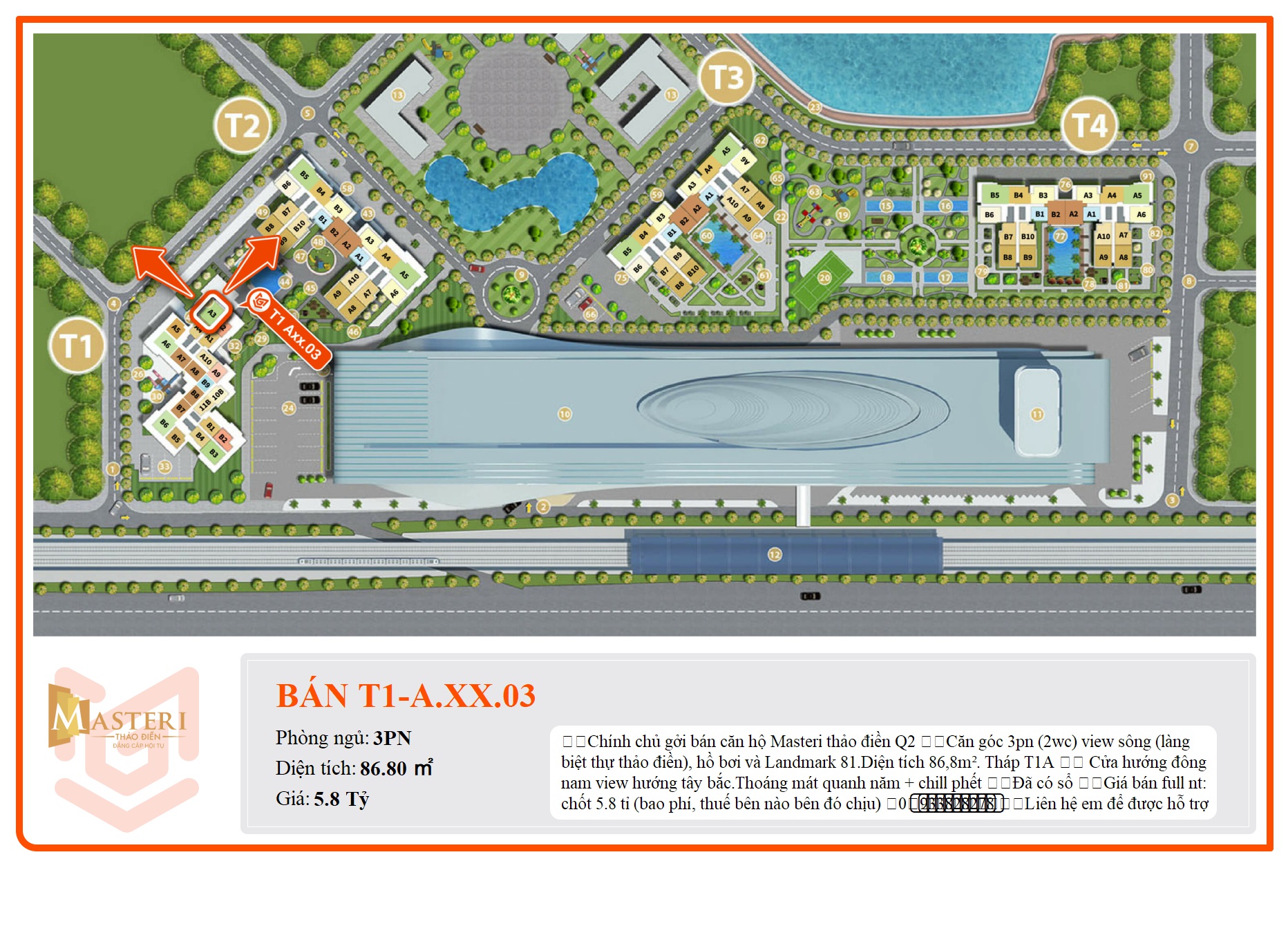 Masteri Thảo Điền là sản phẩm căn hộ cao cấp của tập đoàn Masterise Homes (tiền thân là Thảo Điền Investment). Cách Xa Lộ Hà Nội chỉ vài bước chân, phía sau chỉ 200m là dòng Sông Saigon. Đây thực sự là không gian thiên nhiên trong lành để bạn và gia đình hưởng thụ trọn vẹn hương vị cuộc sống. Ngoài ra, dự án cũng kết nối trực tiếp với ga An Phú (ga số 7), tuyến tàu điện Metro đô thị số 1 Bến Thành – Suối Tiên, đặc biệt bạn chỉ mất 7 phút vào trung tâm Quận 1 và các quận lân cận.