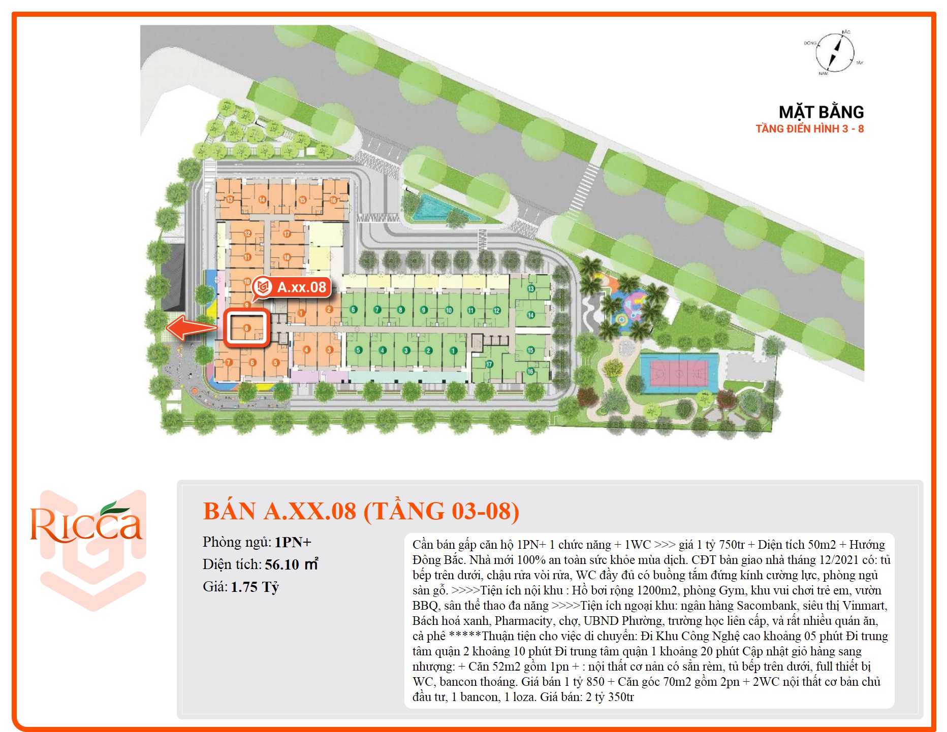 >>>>Tiện ích nội khu : Hồ bơi rộng 1200m2, phòng Gym, khu vui chơi trẻ em, vườn BBQ, sân thể thao đa năng