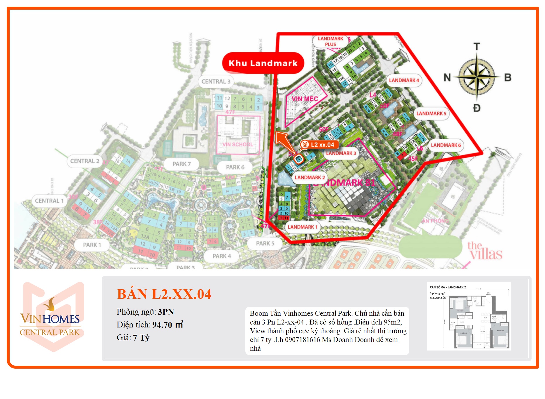 Chủ nhà cần bán căn 3 Pn L2-xx-04 . Đã có sổ hồng .Diện tích 95m2, View thành phố cực kỳ thoáng. Giá rẻ nhất thị trường chỉ 7 tỷ .Lh 0907181616 Ms Doanh Doanh để xem nhà