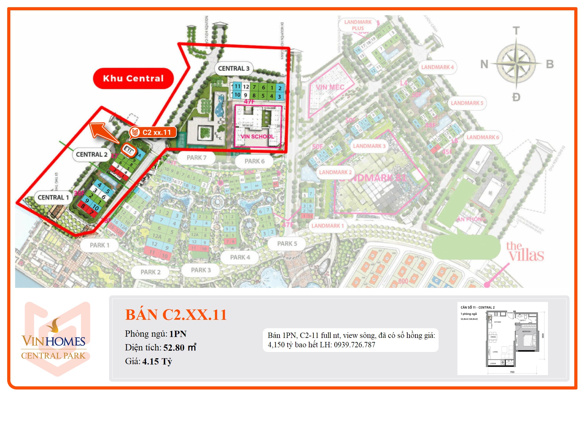 Bán 1PN, C2-11 full nt, view sông, đã có sổ hồng giá: 4,150 tỷ bao hết