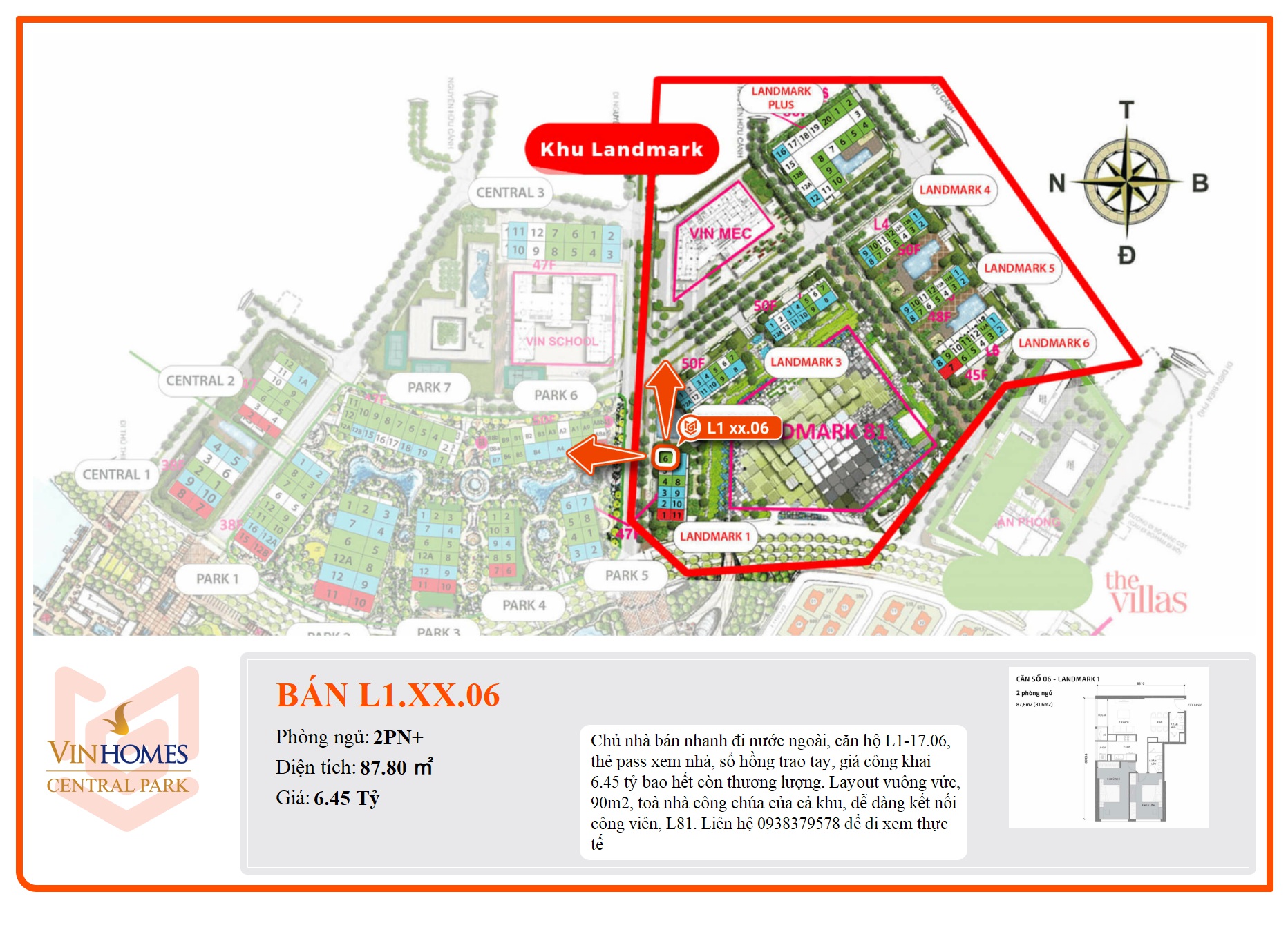 Chủ nhà bán nhanh đi nước ngoài, căn hộ L1-17.06, thẻ pass xem nhà, sổ hồng trao tay, giá công khai 6.45 tỷ bao hết còn thương lượng. Layout vuông vức, 90m2, toà nhà công chúa của cả khu, dễ dàng kết nối công viên, L81. Liên hệ 0938379578 để đi xem thực tế
