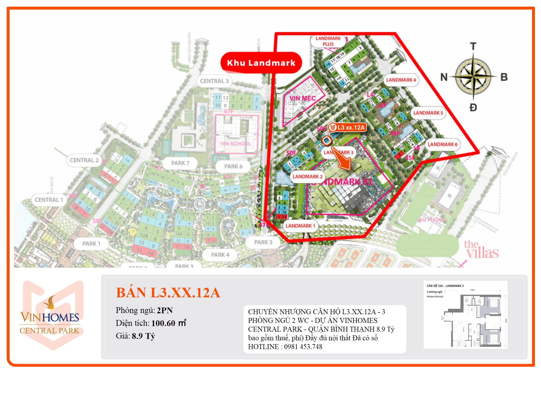 CHUYỂN NHƯỢNG CĂN HỘ L3.XX.12A - 3 PHÒNG NGỦ 2 WC - DỰ ÁN VINHOMES CENTRAL PARK - QUẬN BÌNH THẠNH