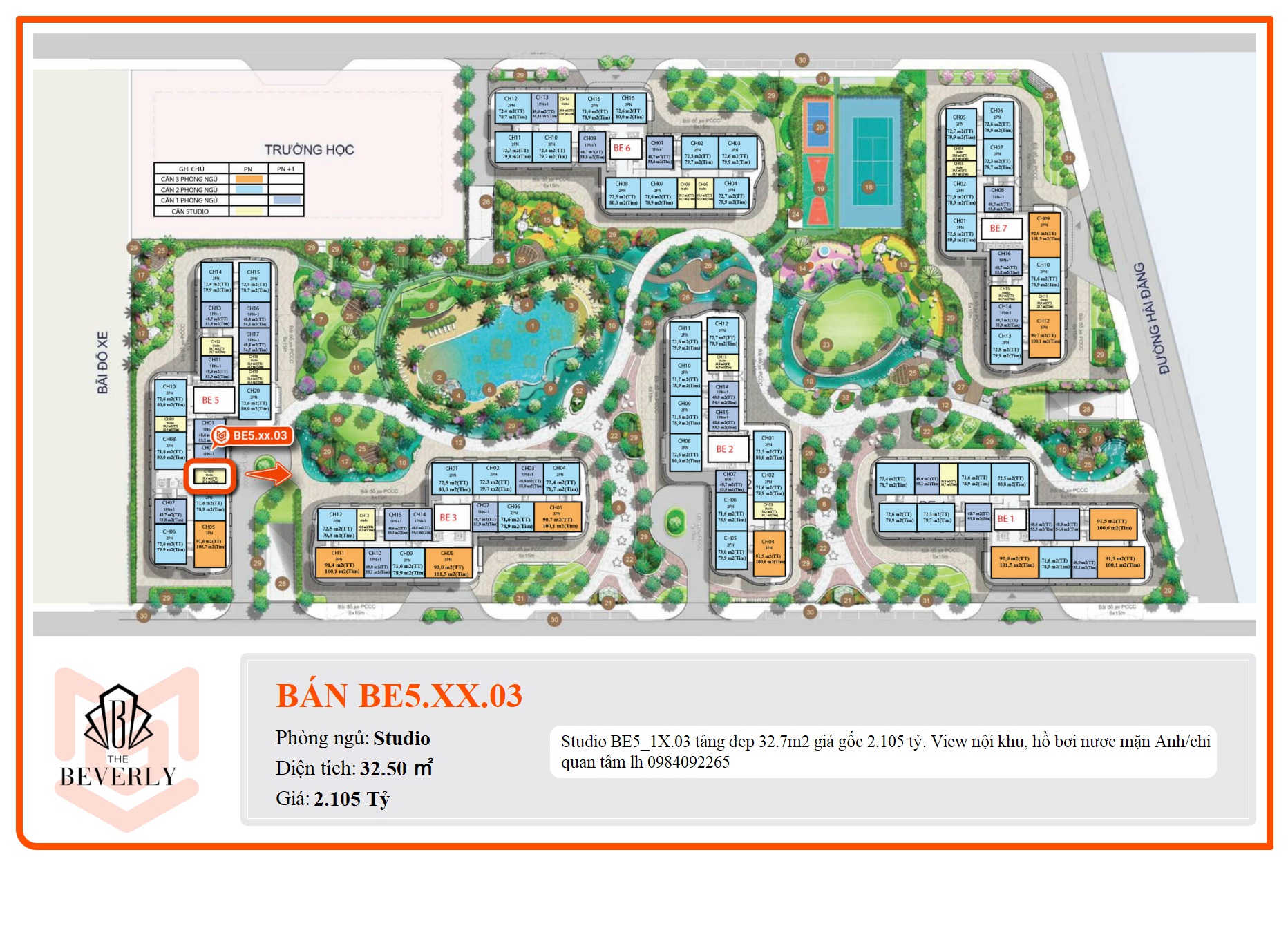 Studio BE5_1X.03 tâng đep 32.7m2 giá gốc 2.105 tỷ. View nội khu, hồ bơi nươc mặn