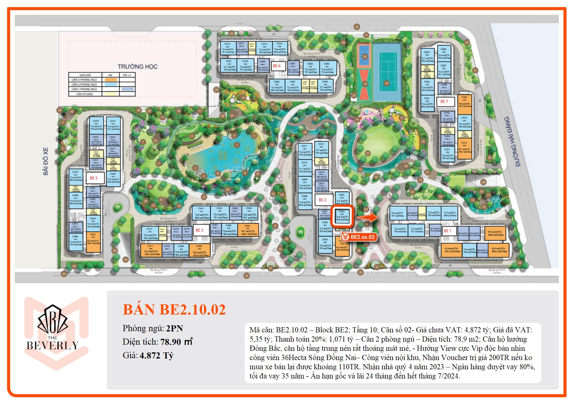 Mã căn: BE2.10.02 – Block BE2; Tầng 10; Căn số 02- Giá chưa VAT: 4,872 tỷ; Giá đã VAT: 5,35 tỷ; Thanh toán 20%: 1,071 tỷ – Căn 2 phòng ngủ – Diện tích: 78,9 m2; Căn hộ hướng Đông Bắc, căn hộ tầng trung nên rất thoáng mát mẻ, - Hướng View cực Vip độc bản nhìn công viên 36Hecta Sông Đồng Nai– Công viên nội khu, Nhận Voucher trị giá 200TR nếu ko mua xe bán lại được khoảng 110TR. Nhận nhà quý 4 năm 2023 – Ngân hàng duyệt vay 80%, tối đa vay 35 năm - Ân hạn gốc và lãi 24 tháng đến hết tháng 7/2024.