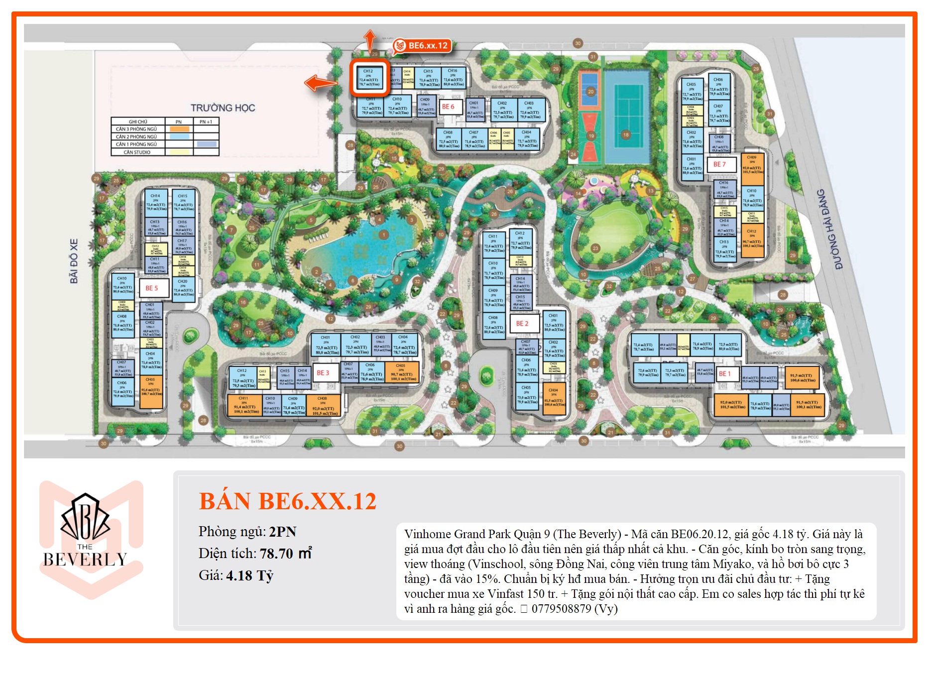Vinhome Grand Park Quận 9 (The Beverly) - Mã căn BE06.20.12, giá gốc 4.18 tỷ. Giá này là giá mua đợt đầu cho lô đầu tiên nên giá thấp nhất cả khu. - Căn góc, kính bo tròn sang trọng, view thoáng (Vinschool, sông Đồng Nai, công viên trung tâm Miyako, và hồ bơi bô cực 3 tầng) - đã vào 15%. Chuẩn bị ký hđ mua bán. - Hưởng trọn ưu đãi chủ đầu tư: + Tặng voucher mua xe Vinfast 150 tr. + Tặng gói nội thất cao cấp. Em co sales hợp tác thì phí tự kê vì anh ra hàng giá gốc. 📲 0779508879 (Vy)