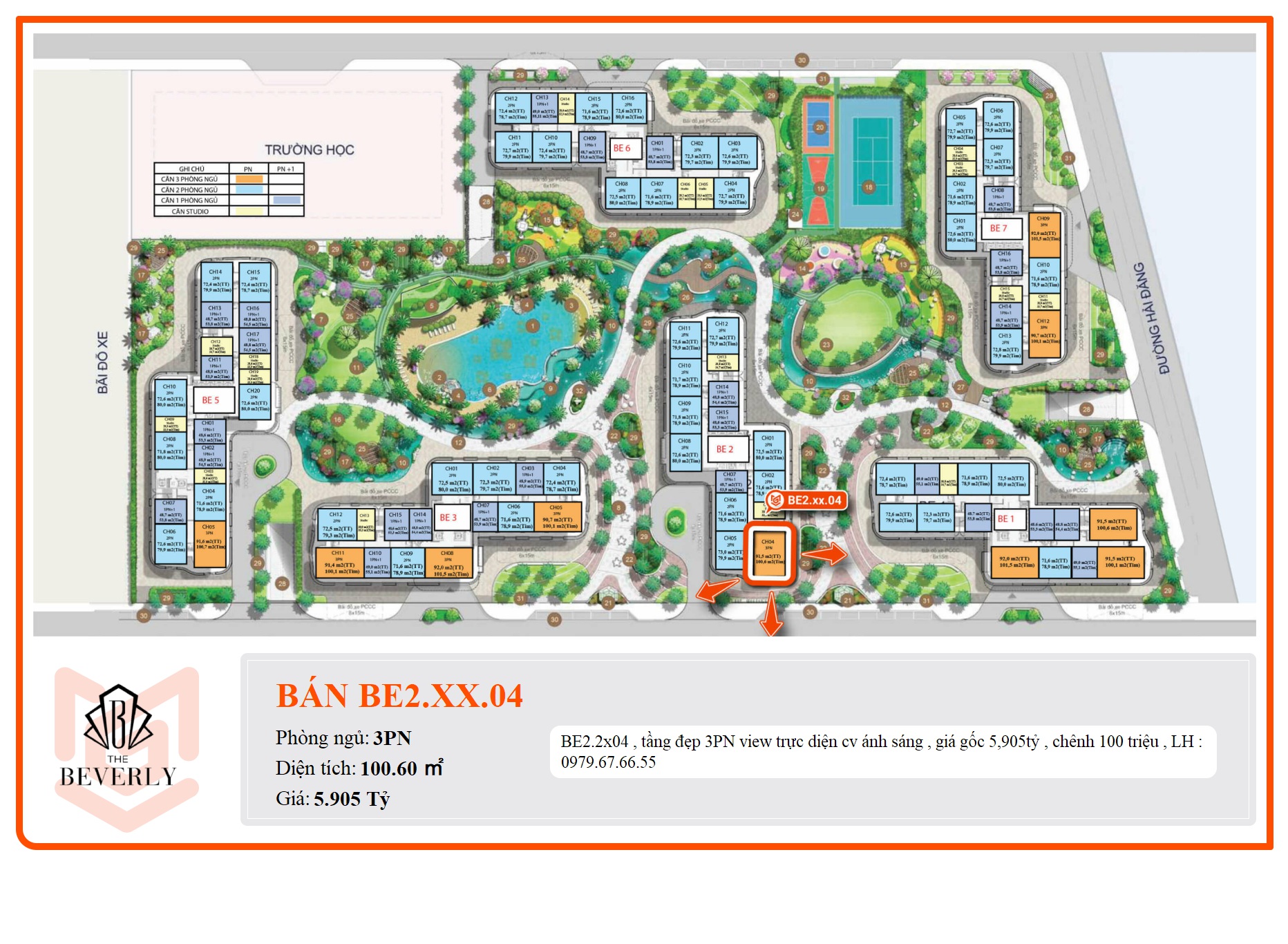 BE2.2x04 , tầng đẹp 3PN view trực diện cv ánh sáng , giá gốc 5,905tỷ , chênh 100 triệu , LH : 0979.67.66.55
