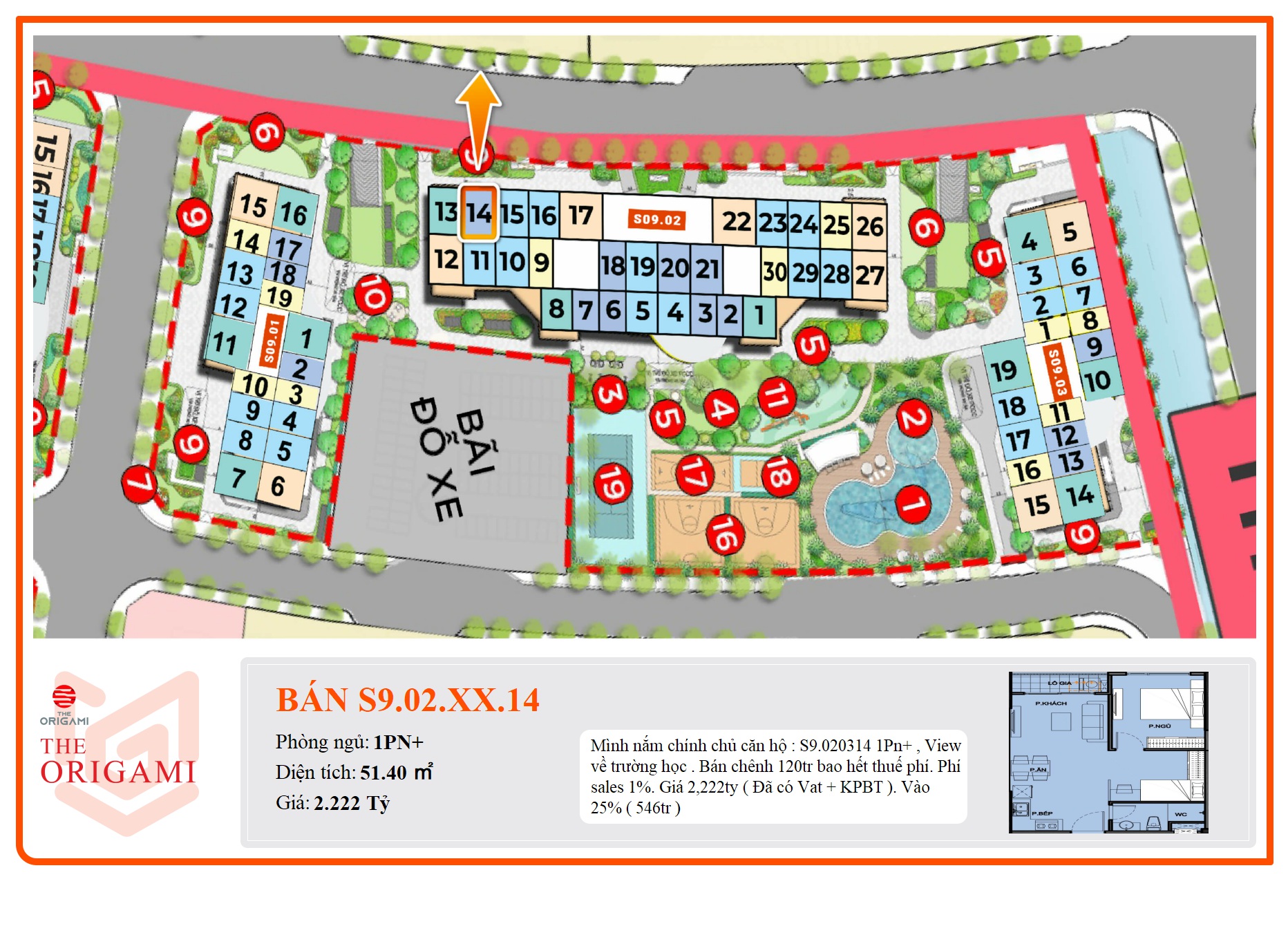 S9.020314 1Pn+ , View về trường học . Bán chênh 120tr bao hết thuế phí. Phí sales 1%. Giá 2,222ty ( Đã có Vat + KPBT ). Vào 25% ( 546tr )