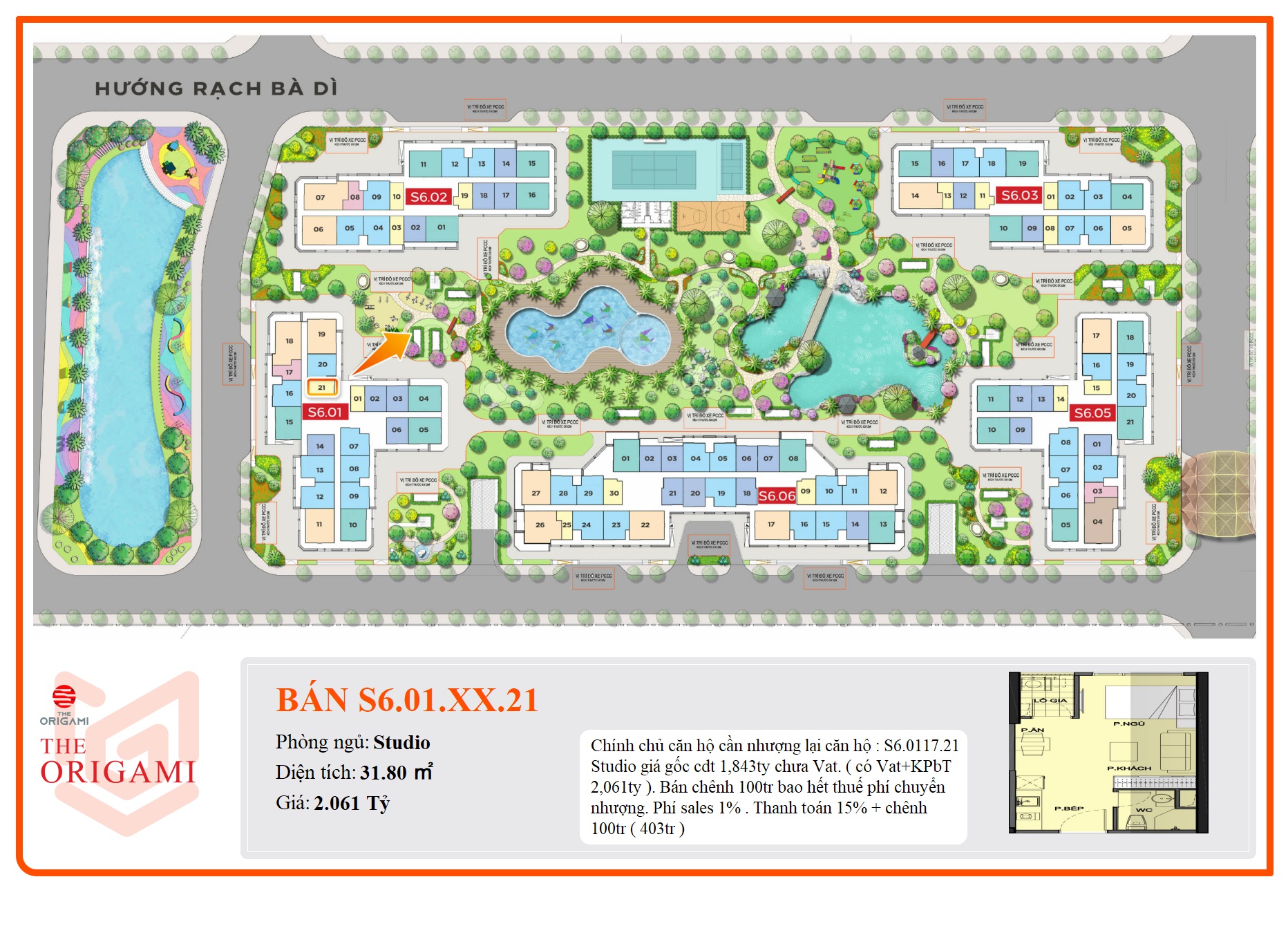 S6.0117.21 Studio giá gốc cdt 1,843ty chưa Vat. ( có Vat+KPbT 2,061ty ). Bán chênh 100tr bao hết thuế phí chuyển nhượng. Phí sales 1% . Thanh toán 15% + chênh 100tr ( 403tr )