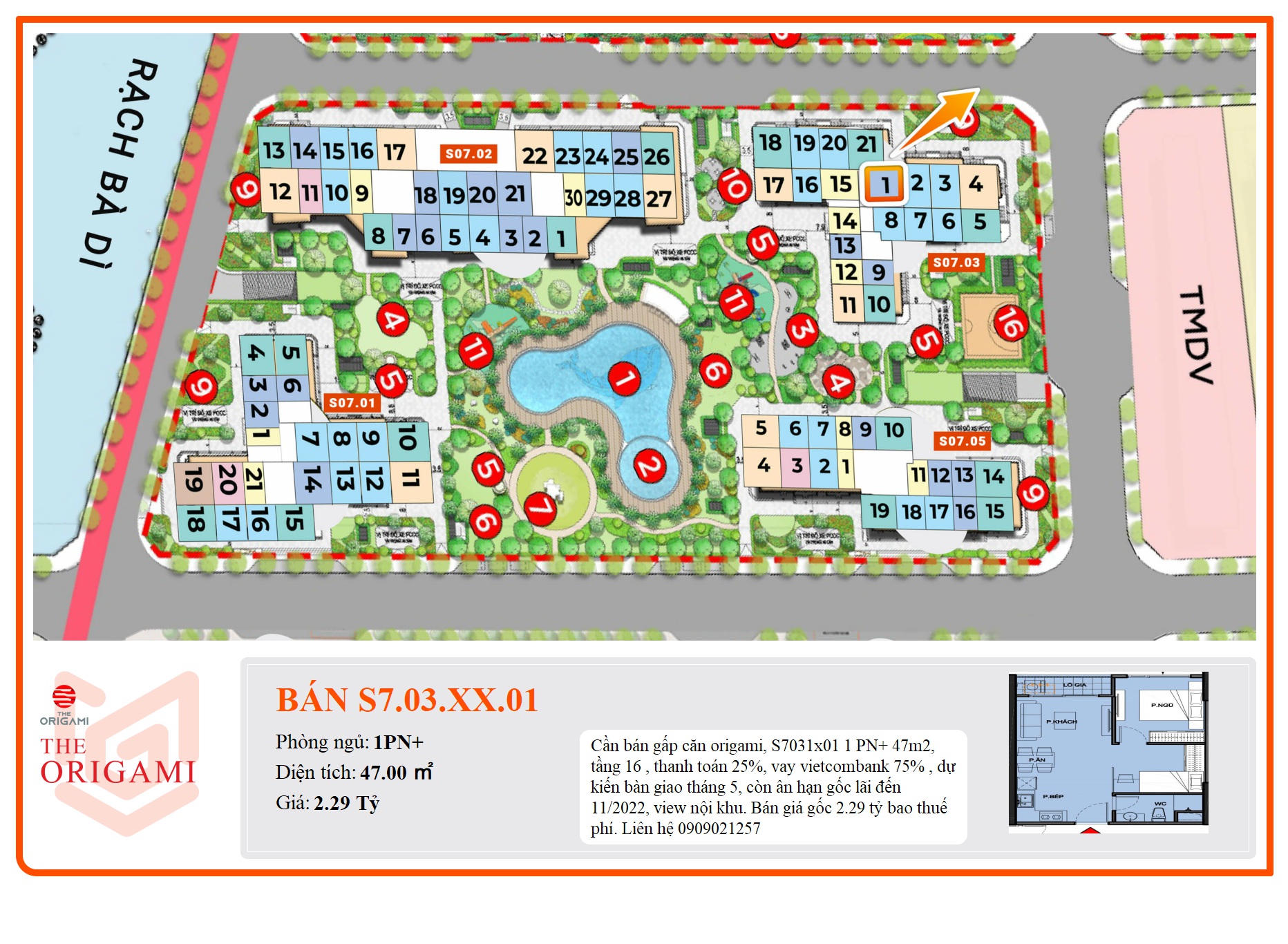Cần bán gấp căn origami, S7031x01 1 PN+ 47m2, tầng 16 , thanh toán 25%, vay vietcombank 75% , dự kiến bàn giao tháng 5, còn ân hạn gốc lãi đến 11/2022, view nội khu. Bán giá gốc 2.29 tỷ bao thuế phí. Liên hệ 0909021257