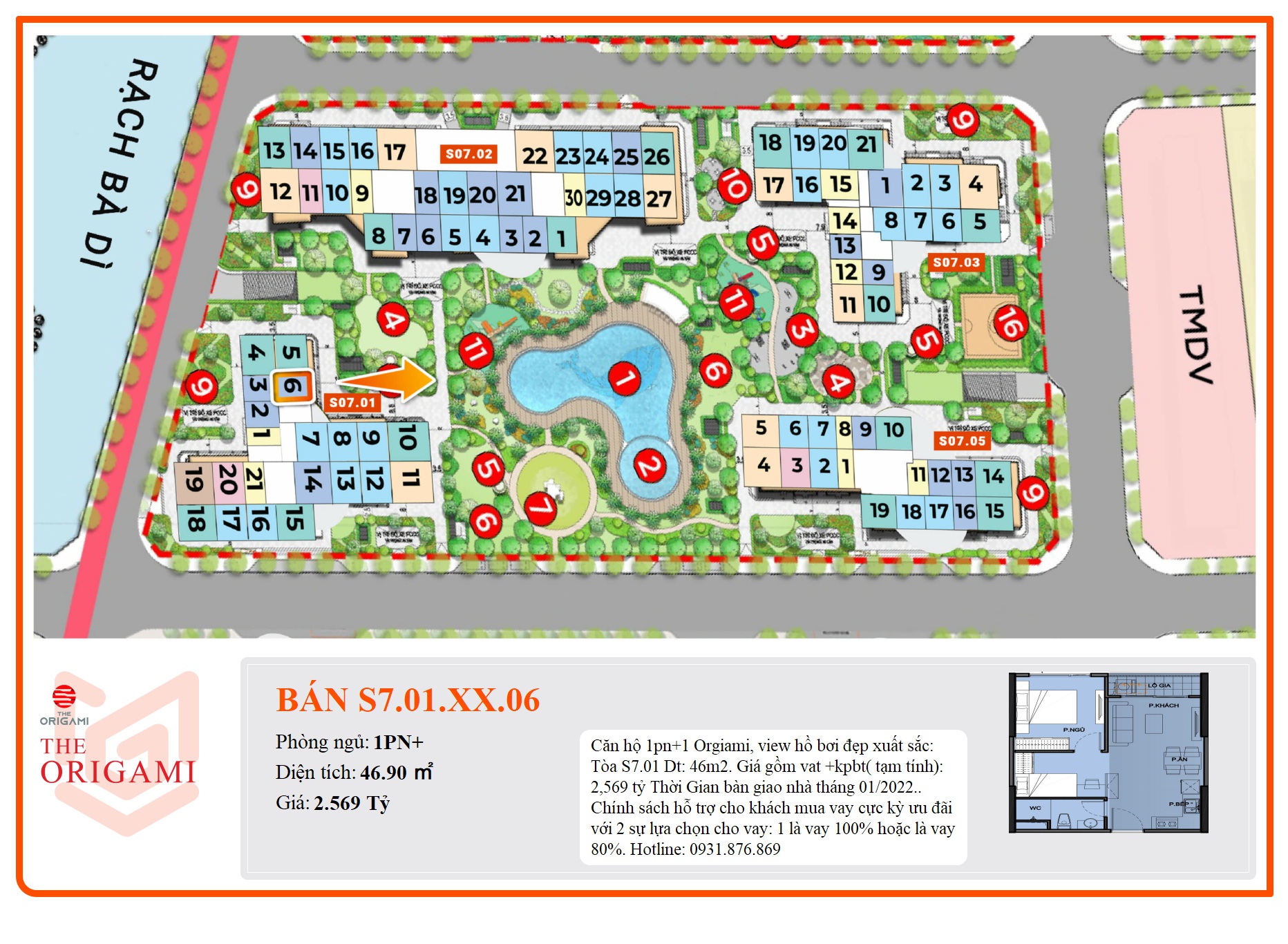 Căn hộ 1pn+1 Orgiami, view hồ bơi đẹp xuất sắc: