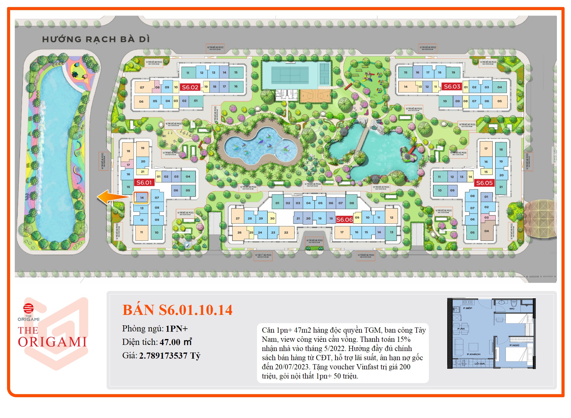 Căn 1pn+ 47m2 hàng độc quyền TGM, ban công Tây Nam, view công viên cầu vồng. Thanh toán 15% nhận nhà vào tháng 5/2022. Hưởng đầy đủ chính sách bán hàng từ CĐT, hỗ trợ lãi suất, ân hạn nợ gốc đến 20/07/2023.