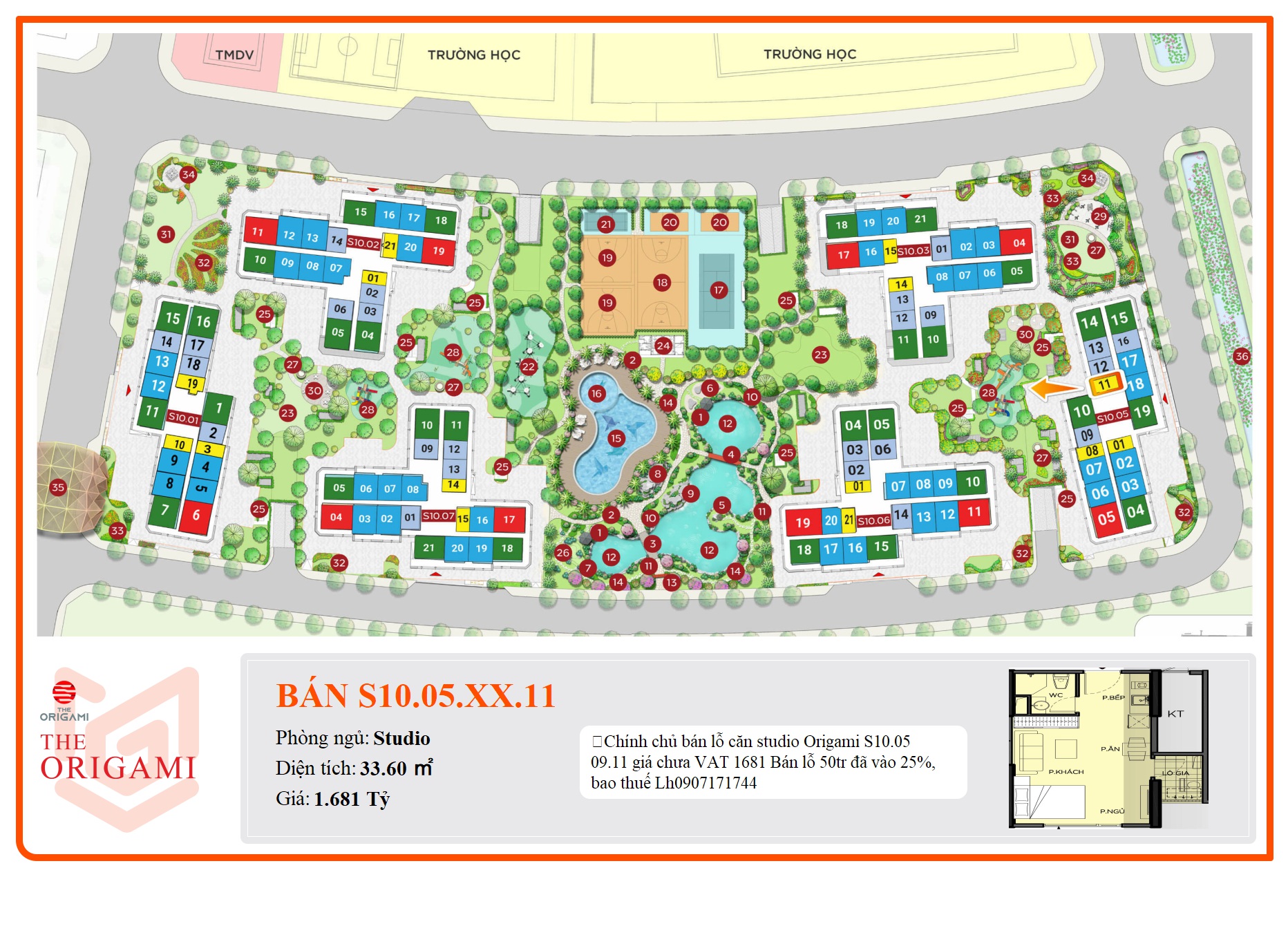 🌹Chính chủ bán lỗ căn studio Origami S10.05 09.11 giá chưa VAT 1681 Bán lỗ 50tr đã vào 25%, bao thuế Lh0907171744