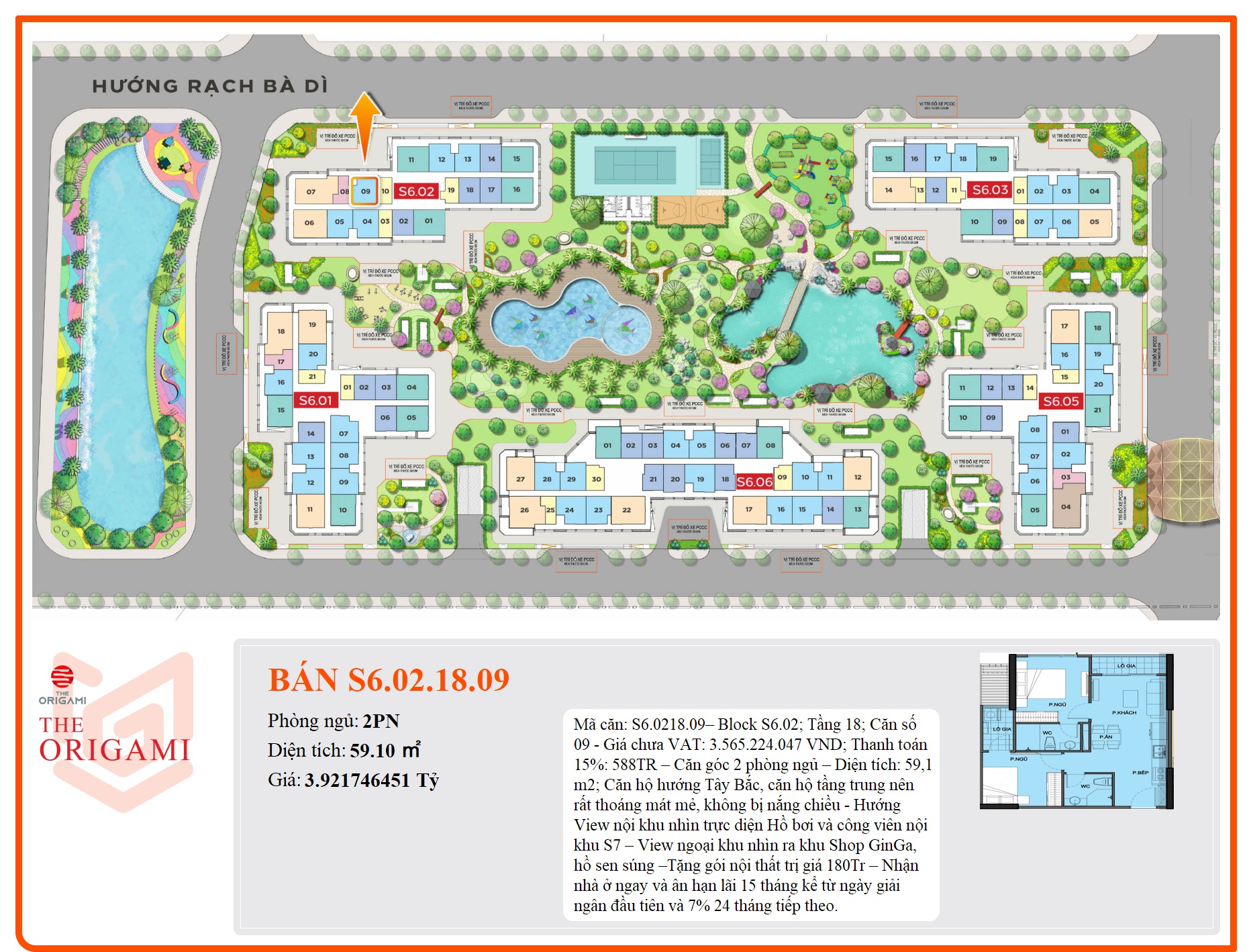 Mã căn: S6.0218.09– Block S6.02; Tầng 18; Căn số 09 - Giá chưa VAT: 3.565.224.047 VND; Thanh toán 15%: 588TR – Căn góc 2 phòng ngủ – Diện tích: 59,1 m2; Căn hộ hướng Tây Bắc, căn hộ tầng trung nên rất thoáng mát mẻ, không bị nắng chiều - Hướng View nội khu nhìn trực diện Hồ bơi và công viên nội khu S7 – View ngoại khu nhìn ra khu Shop GinGa, hồ sen súng –Tặng gói nội thất trị giá 180Tr – Nhận nhà ở ngay và ân hạn lãi 15 tháng kể từ ngày giải ngân đầu tiên và 7% 24 tháng tiếp theo.