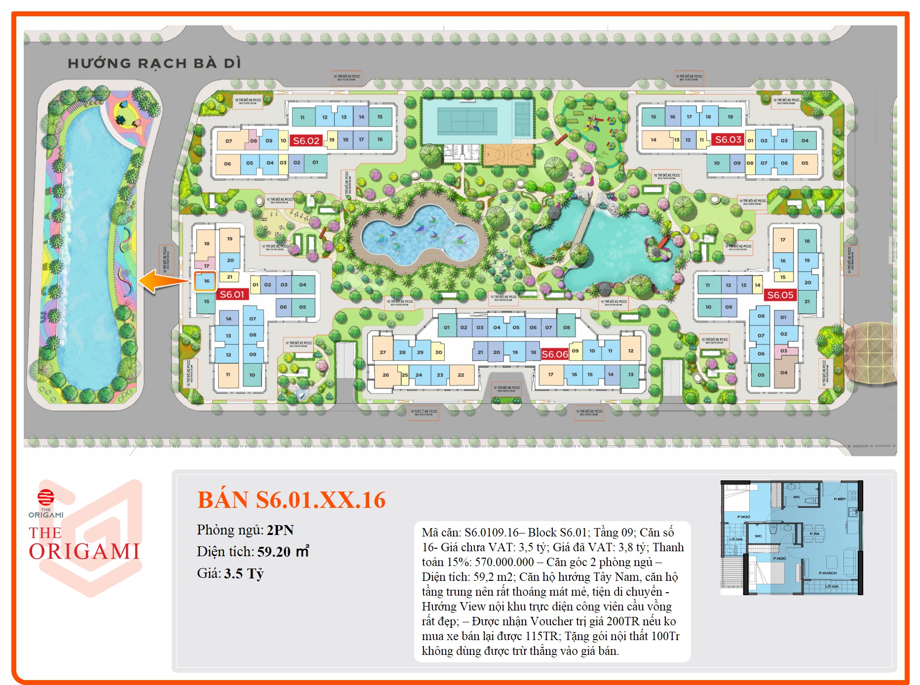 Mã căn: S6.0109.16– Block S6.01; Tầng 09; Căn số 16- Giá chưa VAT: 3,5 tỷ; Giá đã VAT: 3,8 tỷ; Thanh toán 15%: 570.000.000 – Căn góc 2 phòng ngủ – Diện tích: 59,2 m2; Căn hộ hướng Tây Nam, căn hộ tầng trung nên rất thoáng mát mẻ, tiện di chuyển - Hướng View nội khu trực diện công viên cầu vồng rất đẹp; – Được nhận Voucher trị giá 200TR nếu ko mua xe bán lại được 115TR; Tặng gói nội thất 100Tr không dùng được trừ thẳng vào giá bán.