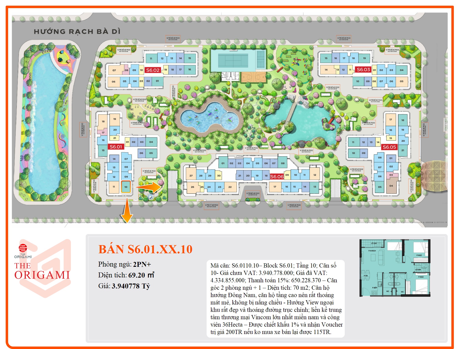 Mã căn: S6.0110.10– Block S6.01; Tầng 10; Căn số 10- Giá chưa VAT: 3.940.778.000; Giá đã VAT: 4.334.855.000; Thanh toán 15%: 650.228.370 – Căn góc 2 phòng ngủ + 1 – Diện tích: 70 m2; Căn hộ hướng Đông Nam, căn hộ tầng cao nên rất thoáng mát mẻ, không bị nắng chiều - Hướng View ngoại khu rất đẹp và thoáng đường trục chính; liền kề trung tâm thương mại Vincom lớn nhất miền nam và công viên 36Hecta – Được chiết khấu 1% và nhận Voucher trị giá 200TR nếu ko mua xe bán lại được 115TR.
