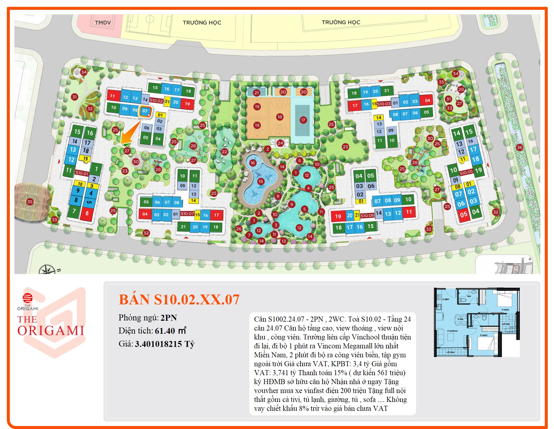 Phân khu The Origami mang đậm phong cách Nhật Bản, quy mô tương đương khu đô thị Vinhomes Central Park. The Origami thừa hưởng trọn vẹn môi trường sống trong lành, đẳng cấp từ quy hoạch đồng bộ, nền tảng quản lý vận hành thông minh của Vinhomes Grand Park.