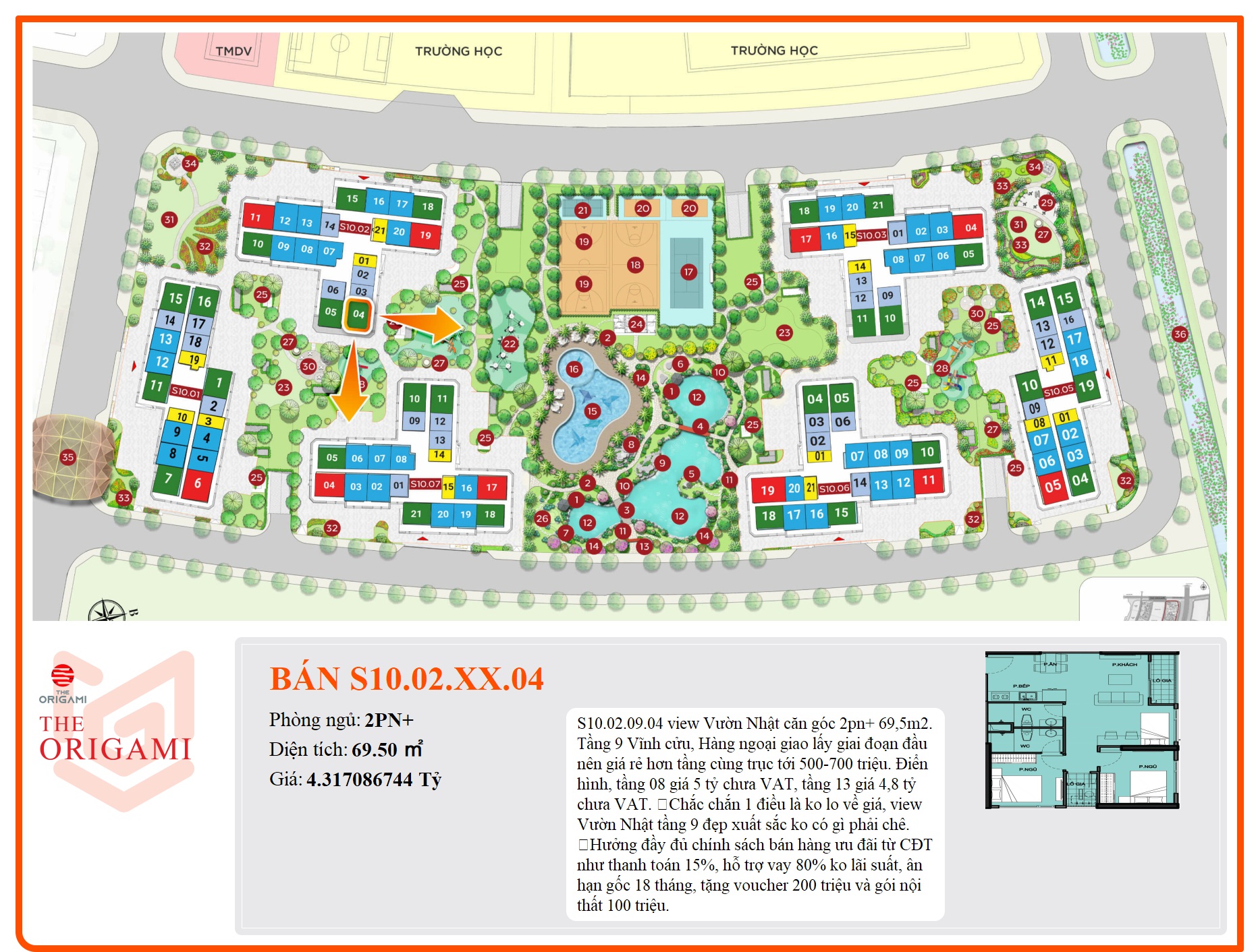S10.02.09.04 view Vườn Nhật căn góc 2pn+ 69,5m2. Tầng 9 Vĩnh cửu, Hàng ngoại giao lấy giai đoạn đầu nên giá rẻ hơn tầng cùng trục tới 500-700 triệu.