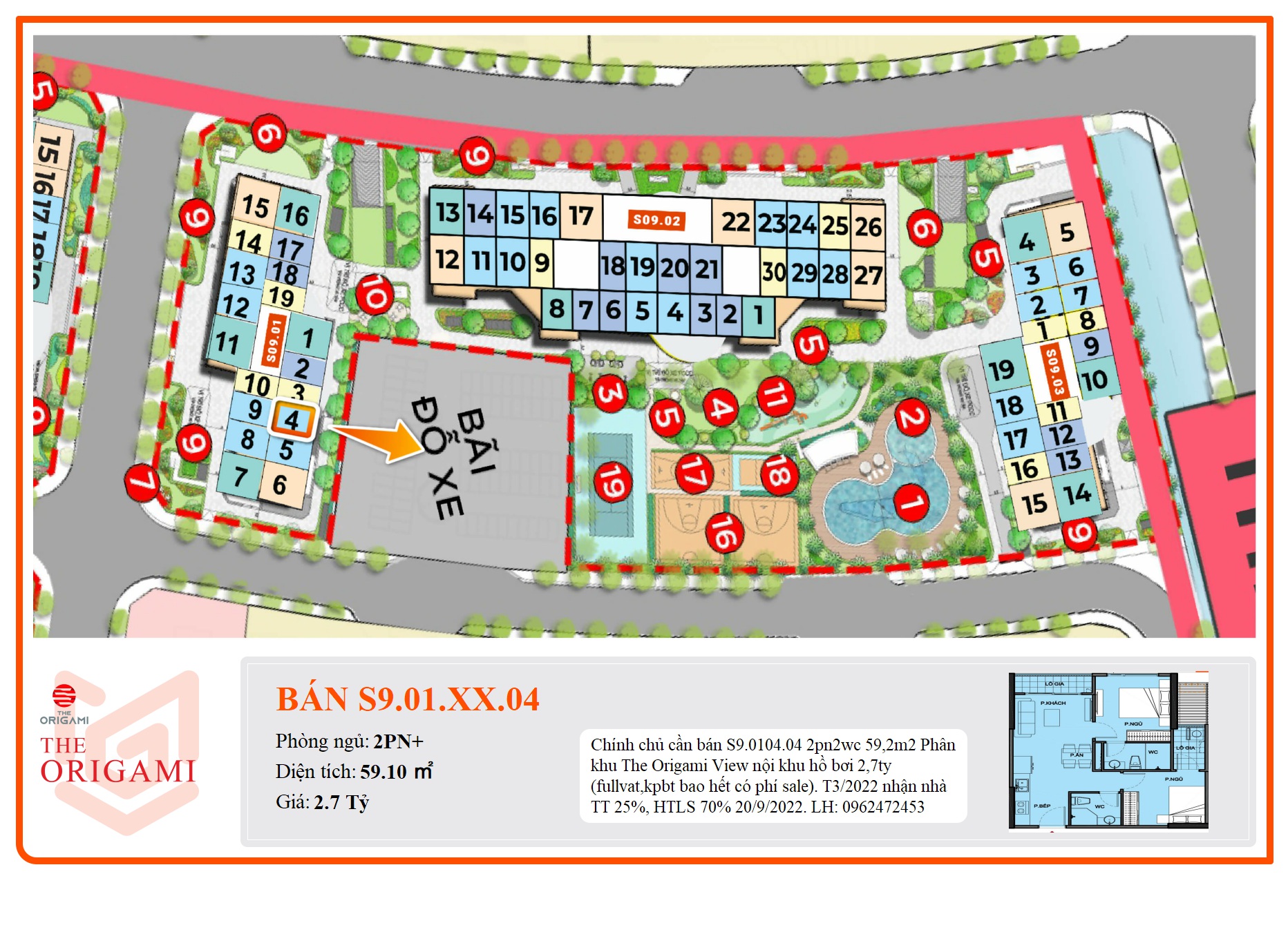 Chính chủ cần bán S9.0104.04 2pn2wc 59,2m2 Phân khu The Origami View nội khu hồ bơi 2,7ty (fullvat,kpbt bao hết có phí sale). T3/2022 nhận nhà TT 25%, HTLS 70% 20/9/2022.