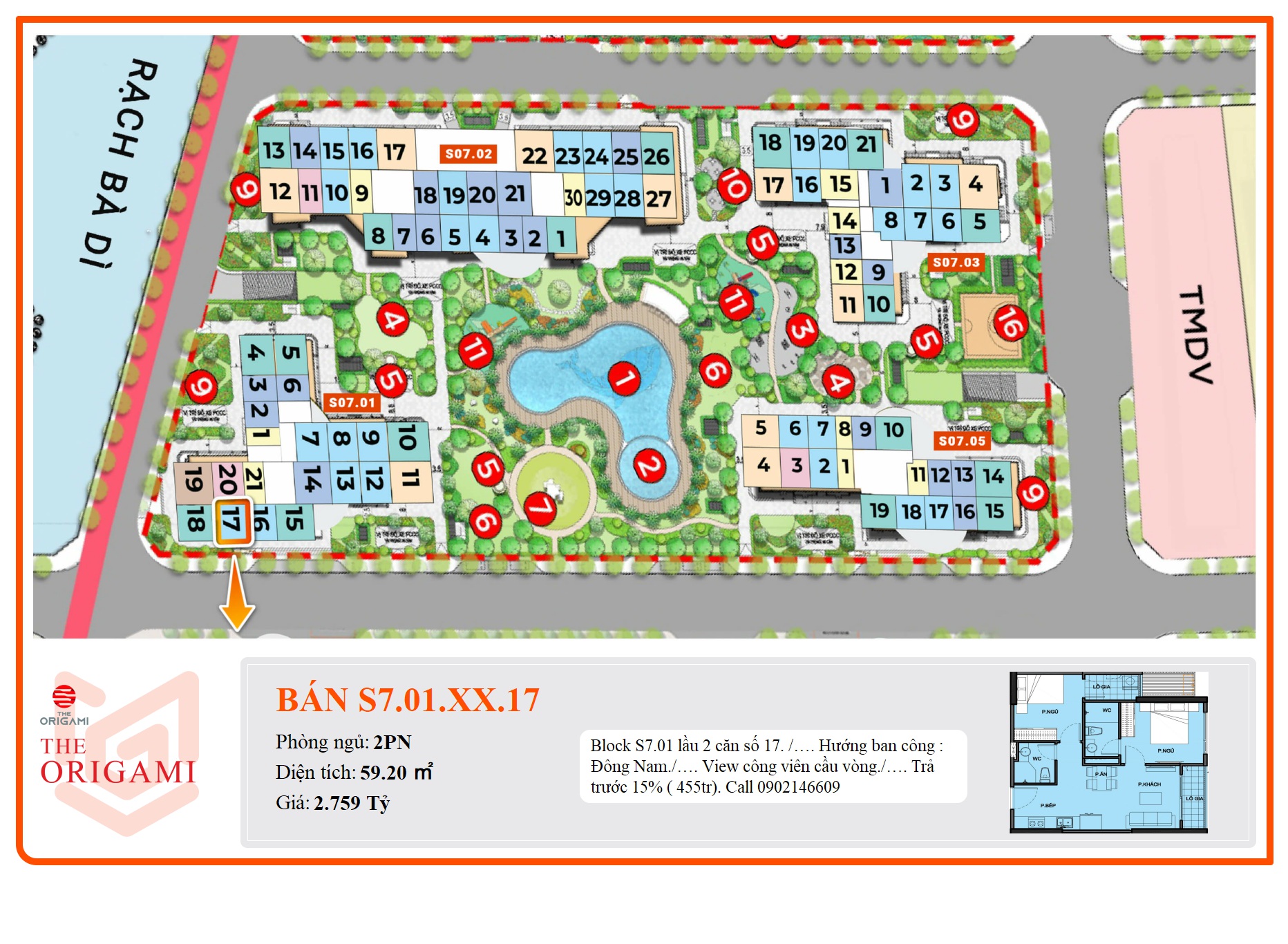 Block S7.01 lầu 2 căn số 17. /…. Hướng ban công : Đông Nam./…. View công viên cầu vòng./…. Trả trước 15% ( 455tr). Call 0902146609